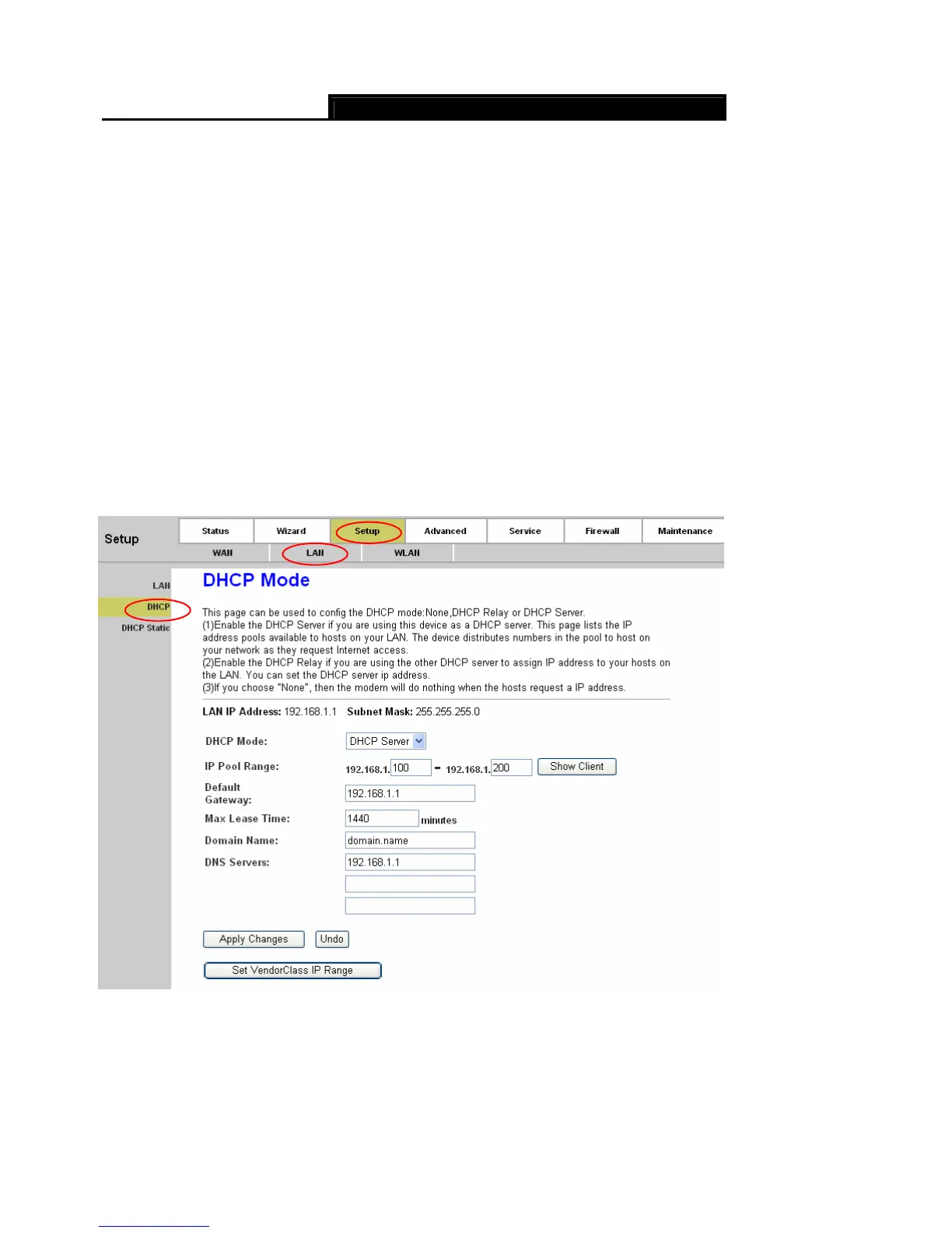 Choose “Setup→LAN→DHCP” menu, and then you will see the DHCP Mode screen (shown in