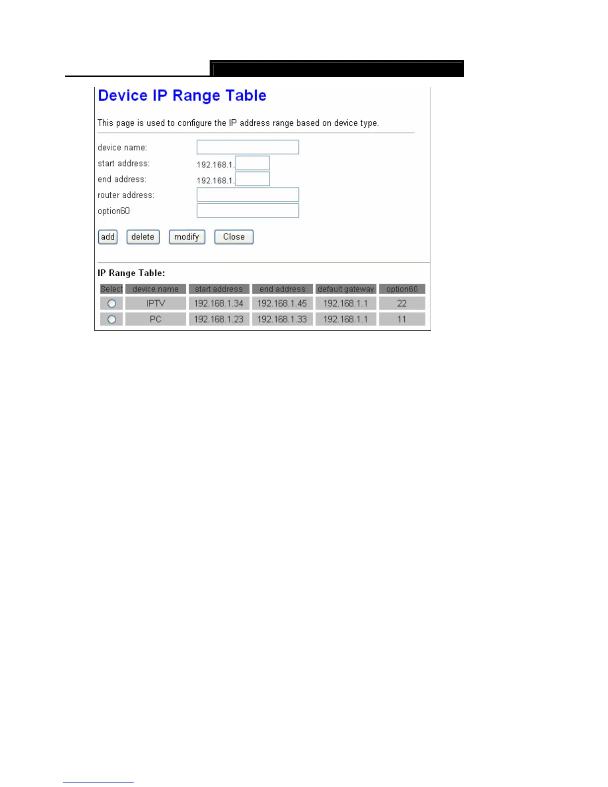 Choose “Setup→LAN→DHCP Static” menu, you can view and add a static address for client via