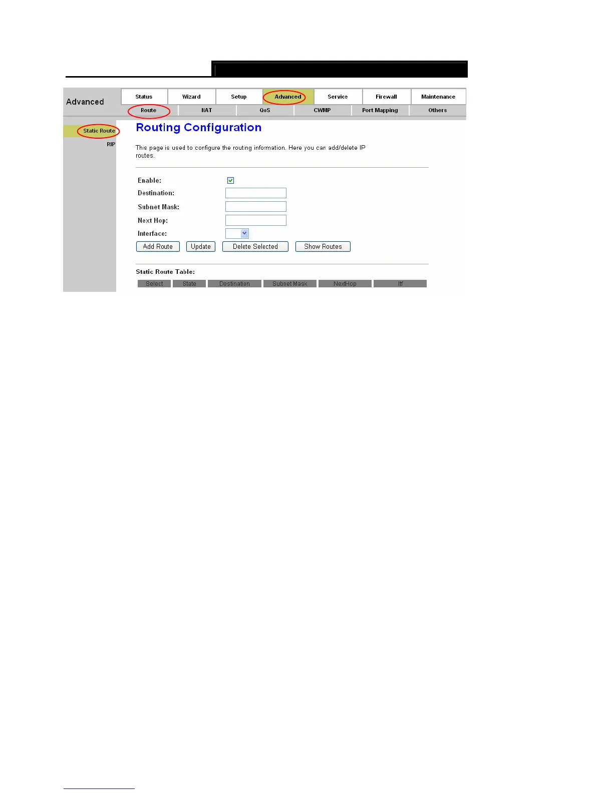 Choose “Advanced→Route→RIP” menu, you can configure the RIP settings in the next screen