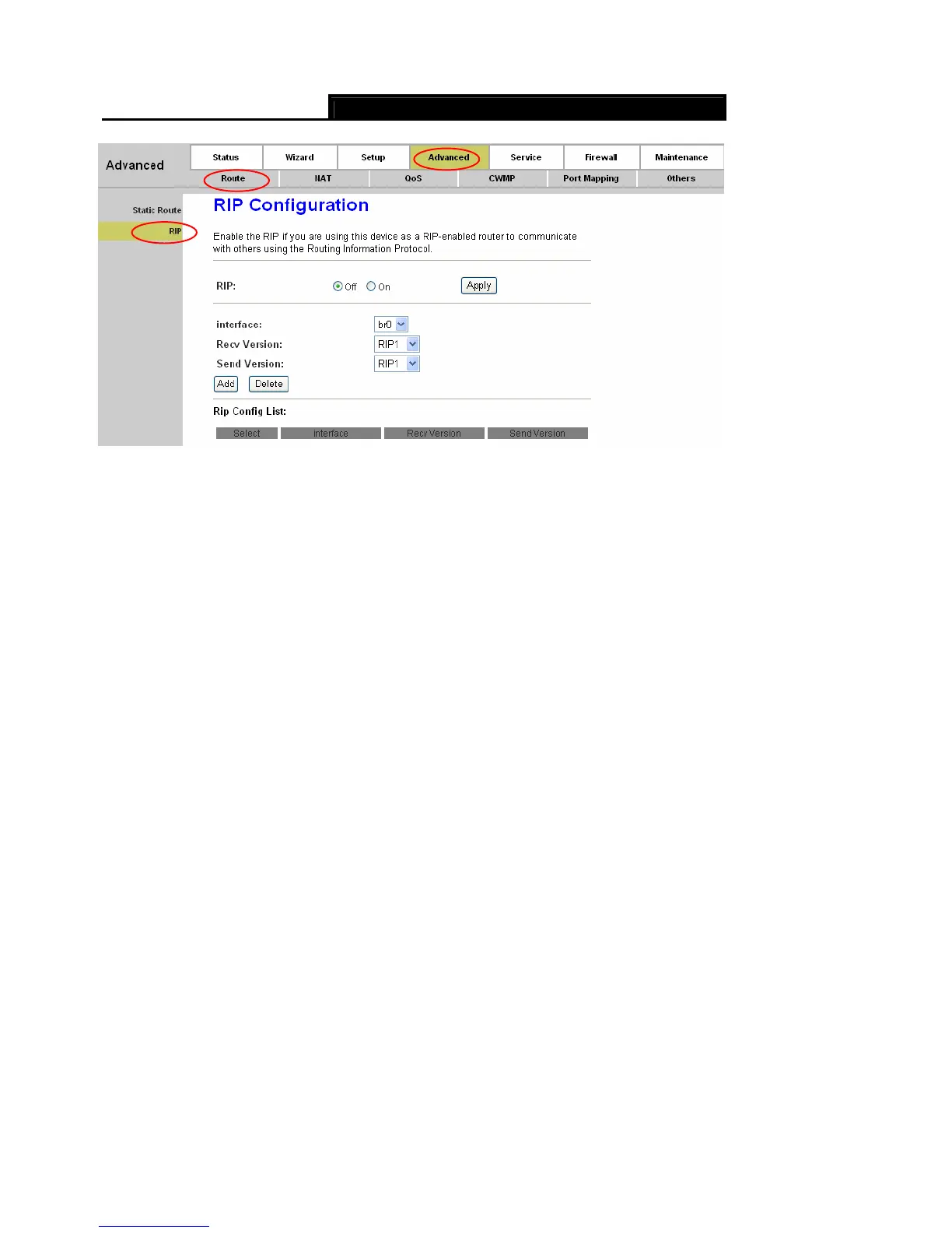 RIP: Select to enable the RIP function or not. Click the Apply button to save your