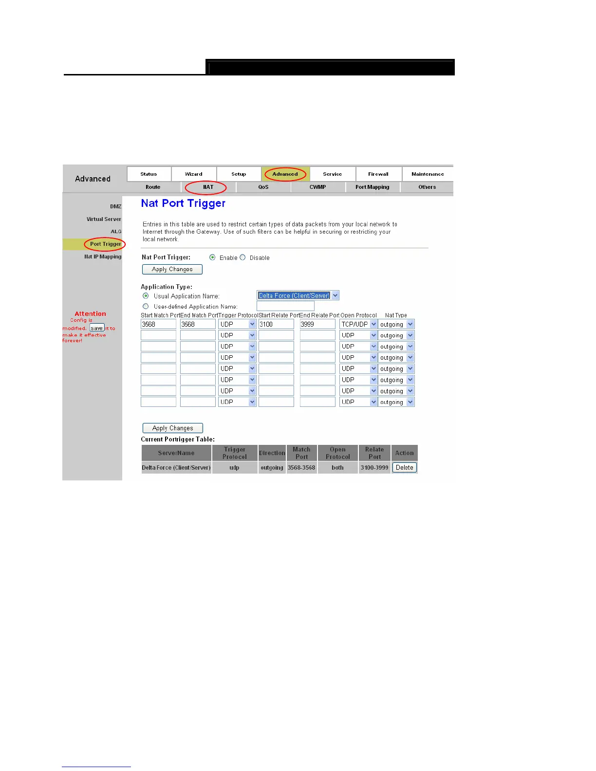 Nat Port rigger: Enable or disable the port trigger function on the device. After selecting,