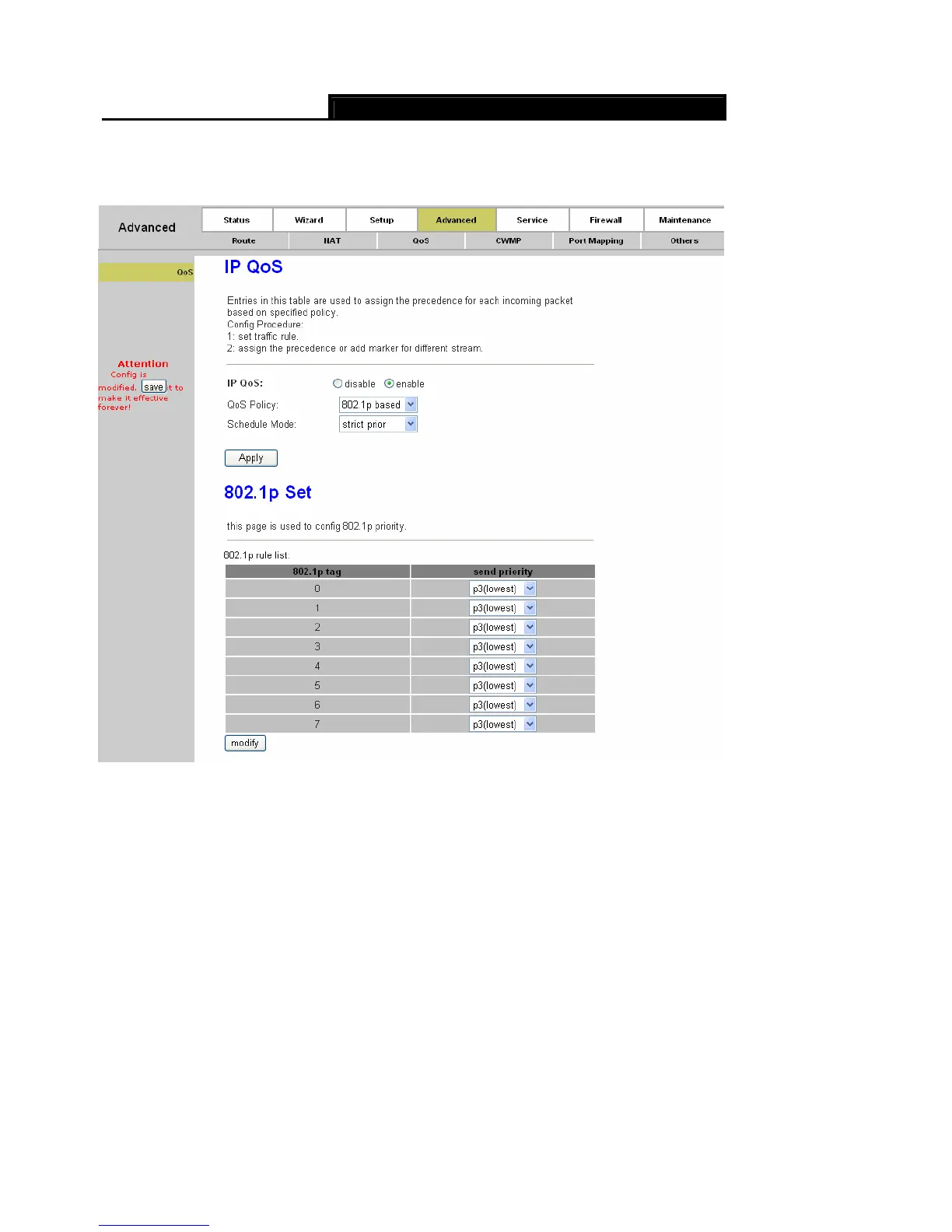 If the QoS policy is “802.1p based”, you should configure the 802.1p setting.