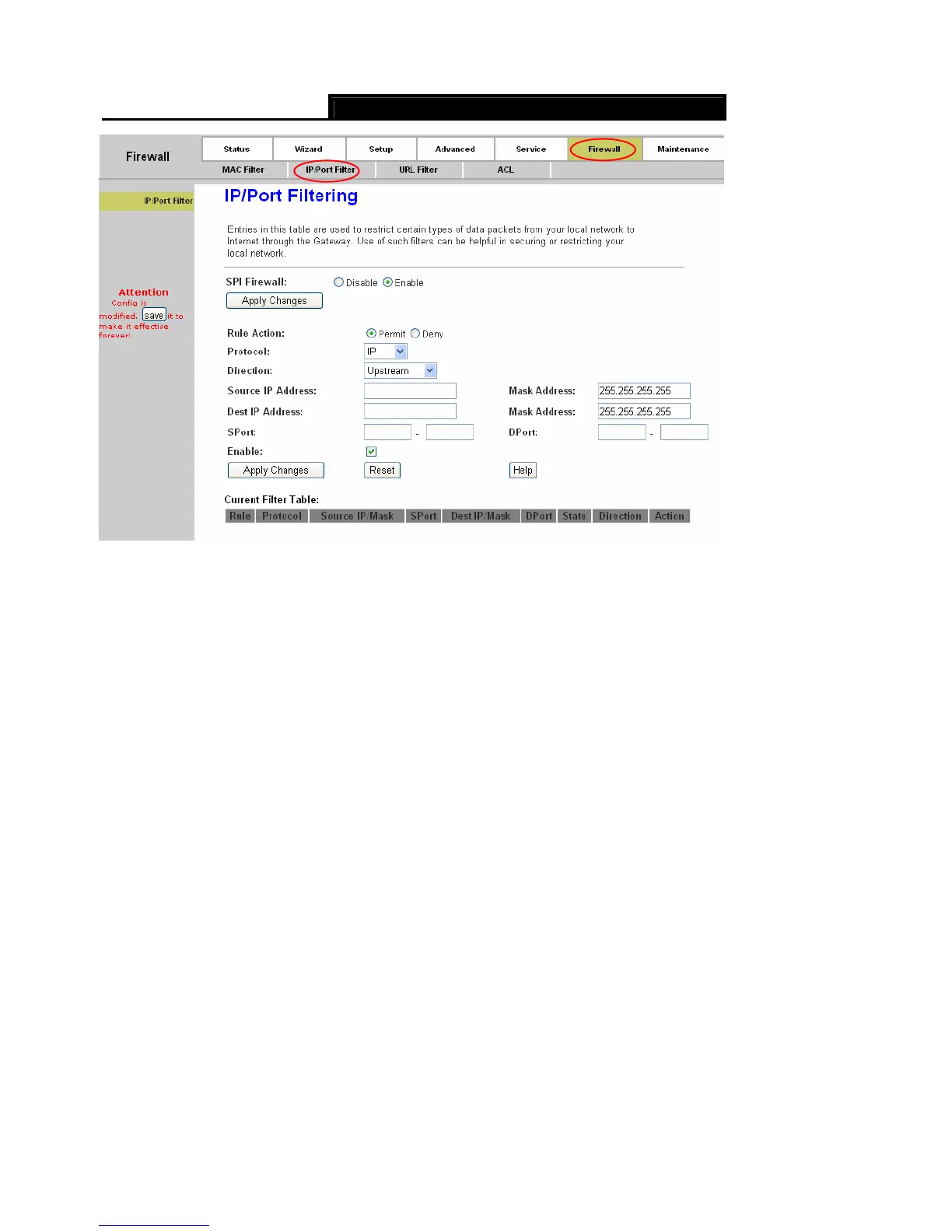 Current Filter table: It shows the current filter rules. You can enable or disable or delete the