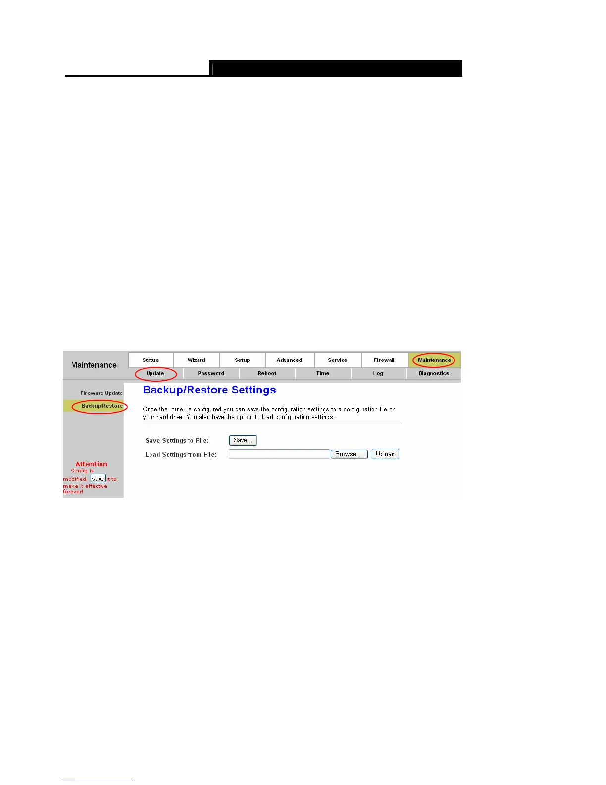 Choose “Maintenance→Update→Backup/Restore”, you can save the current configuration