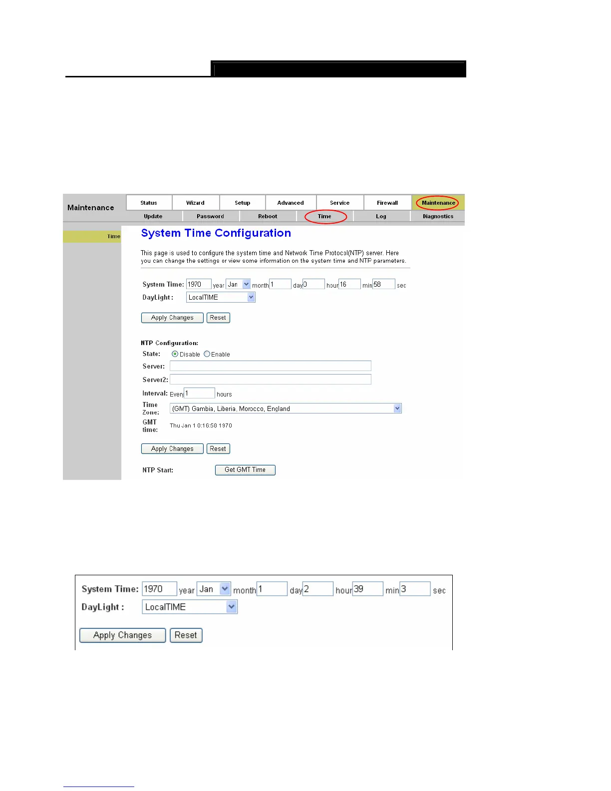 Choose “Maintenance→Time”, you can configure the system time in the screen (shown in Figure