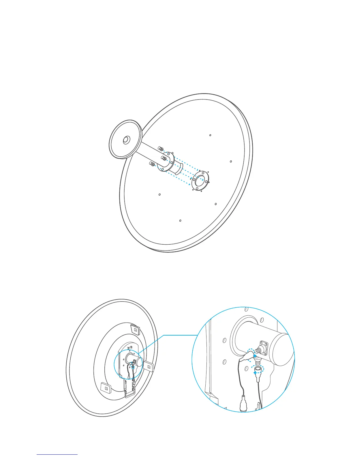 1. Secure the Antenna Feed to the Dish Reflector using the four M4