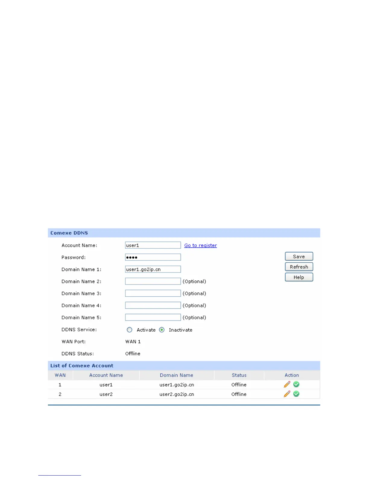Choose the menu Services→Dynamic DNS→Comexe to load the following page.