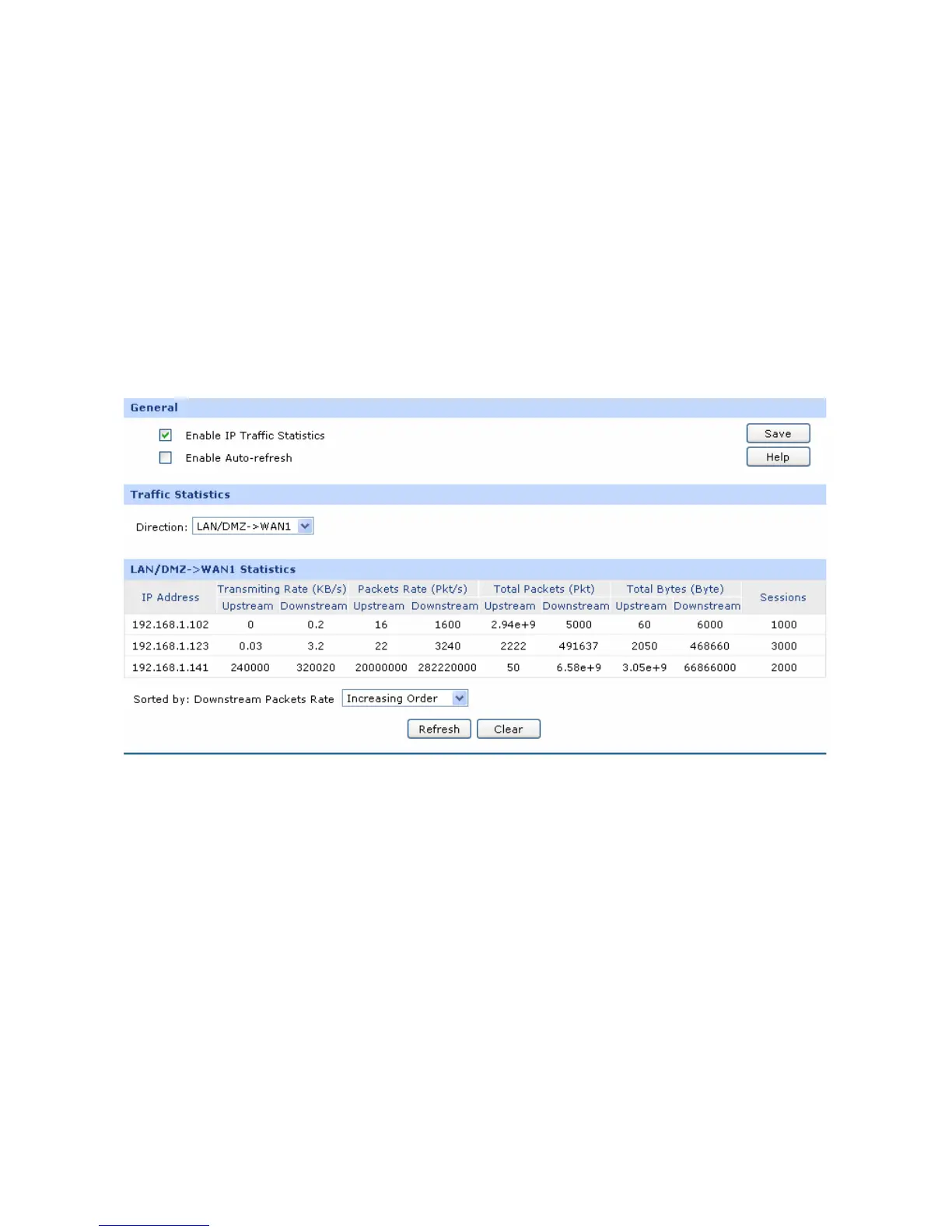 IP Traffic Statistics screen displays the detailed traffic information of each PC on LAN or DMZ.