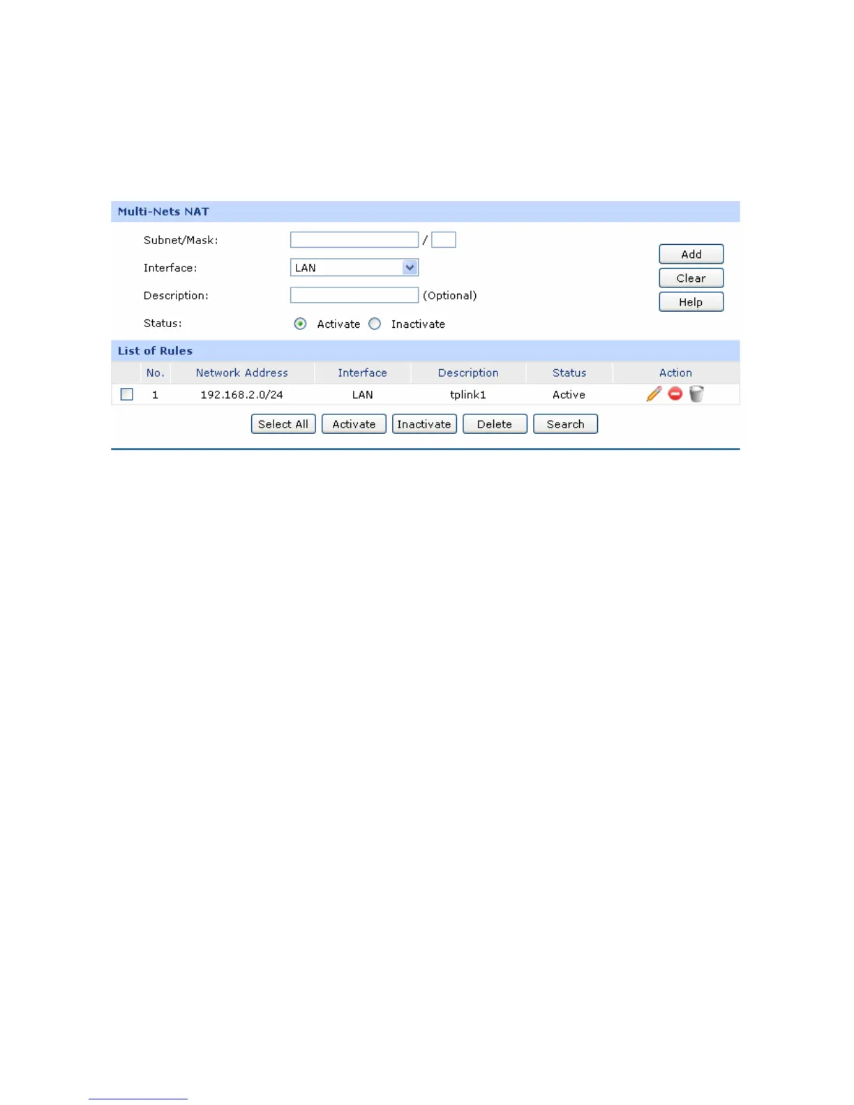 The first entry in Figure 3-32 indicates that: This is a Multi-Nets NAT entry named tplink1. The subnet