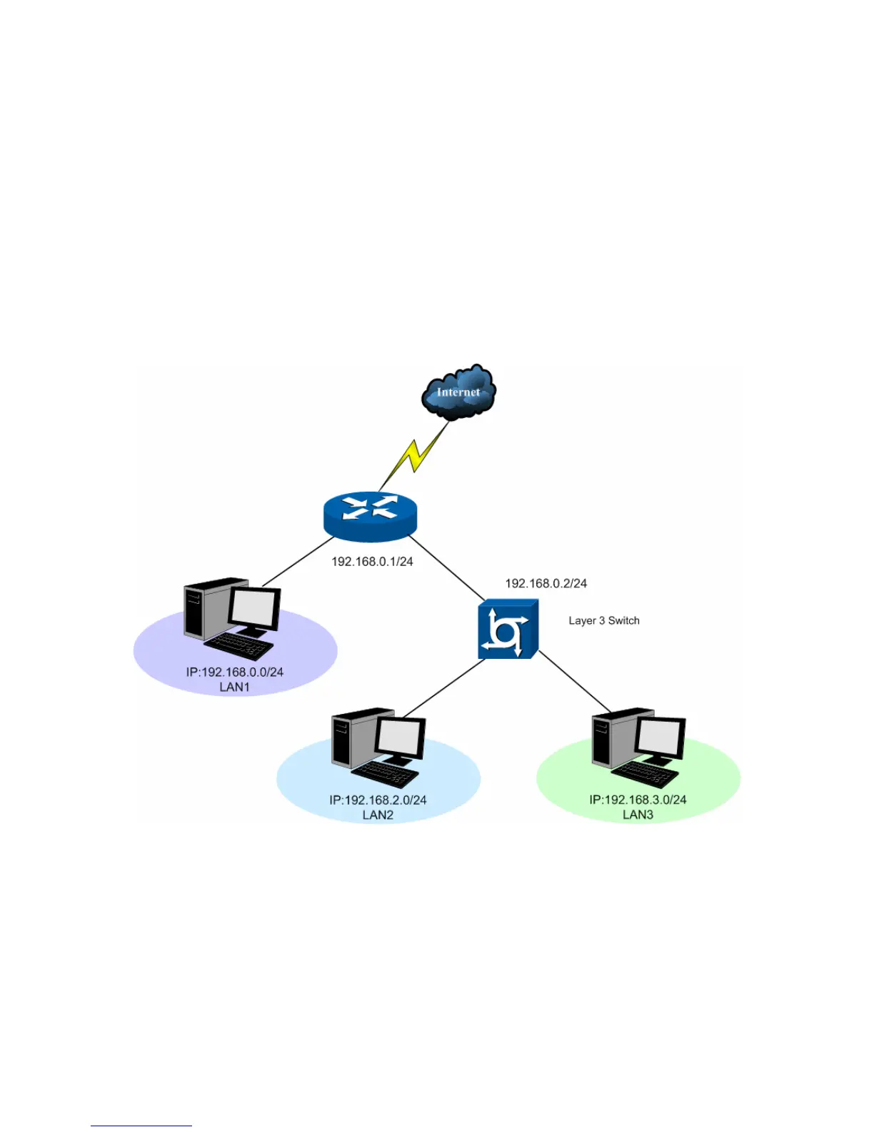 LAN1 is under the router and it uses network segment 192.168.0.0 /24. LAN2 and LAN3 are under a