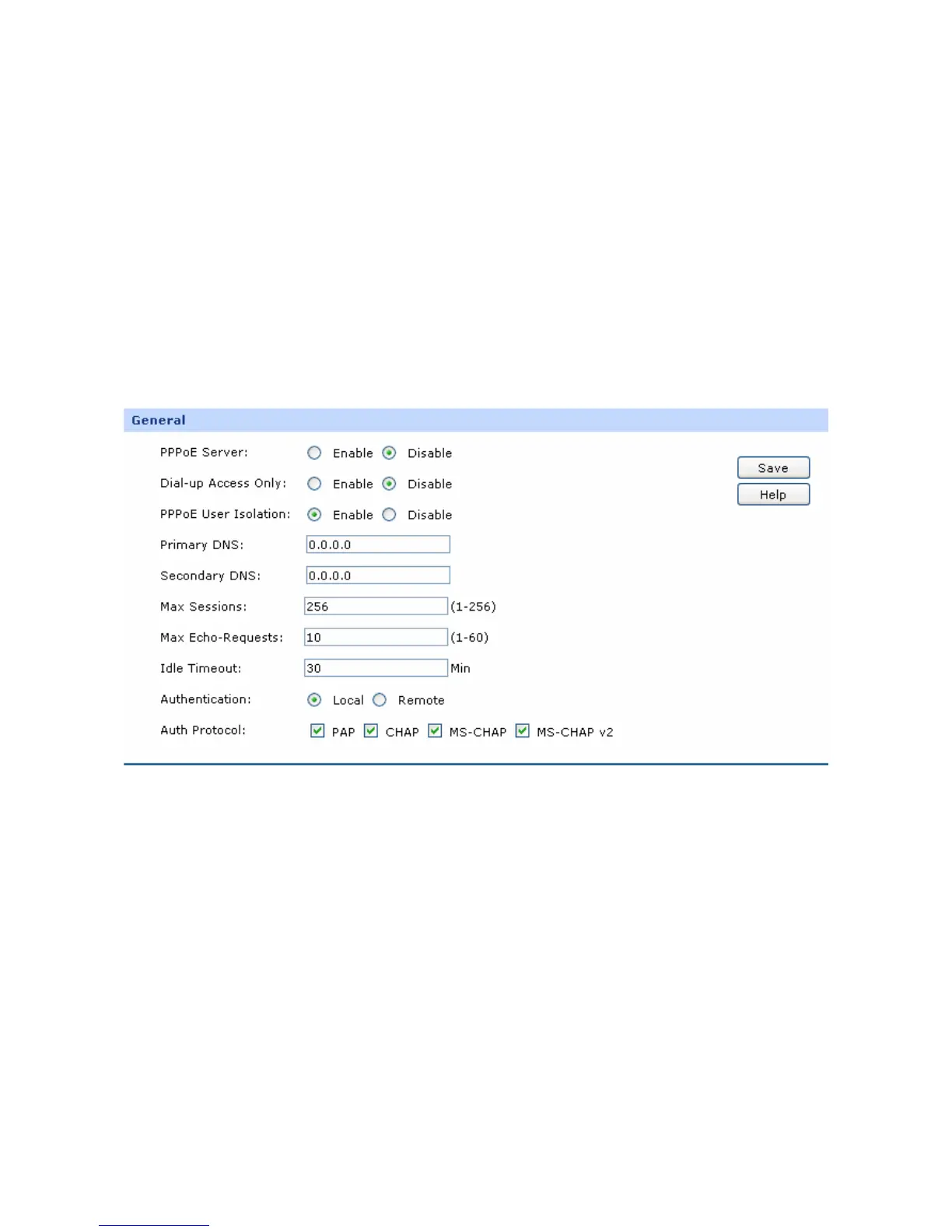 Choose the menu Services→PPPoE Server→General to load the following page.