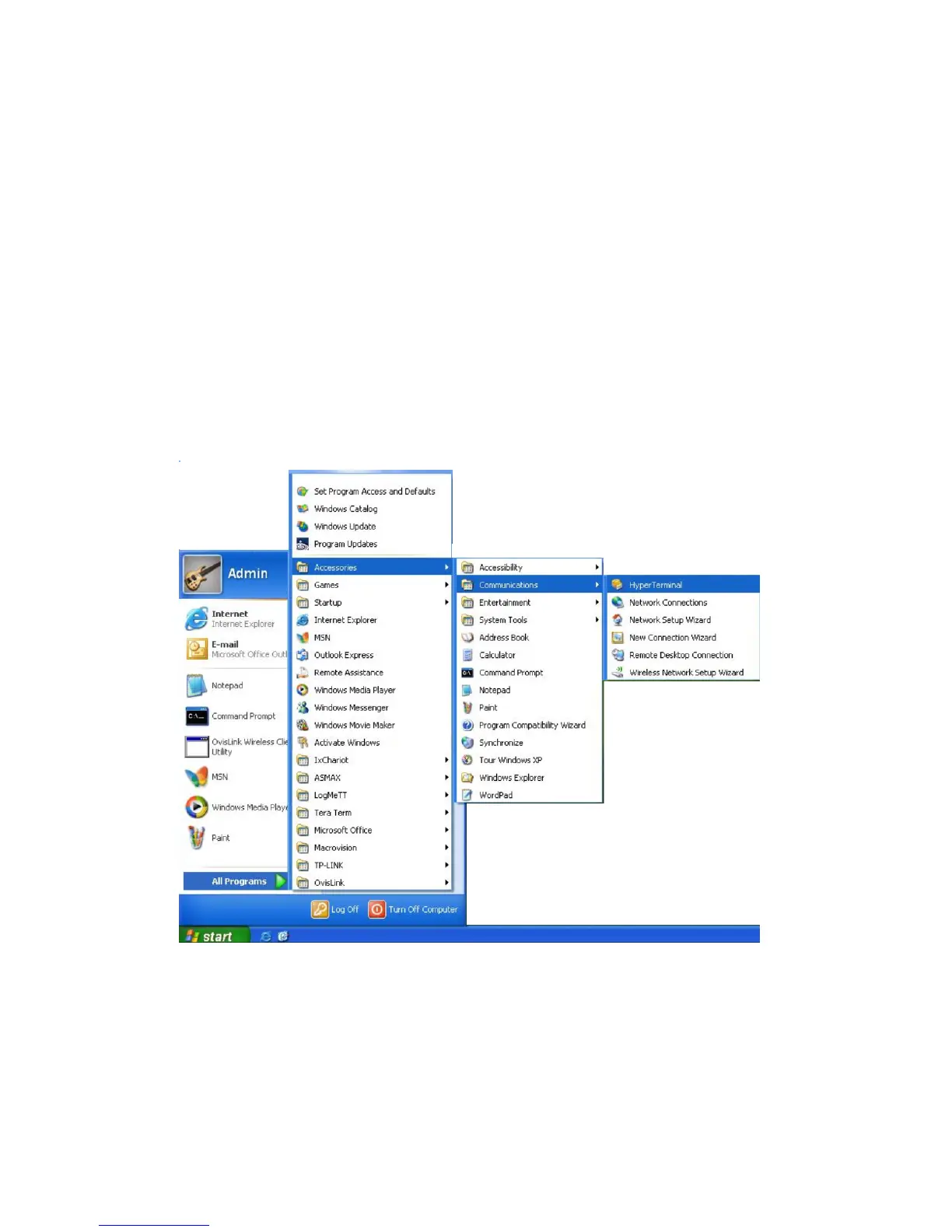 2. Click Start → All Programs → Accessories→ Communications → Hyper Terminal to open the