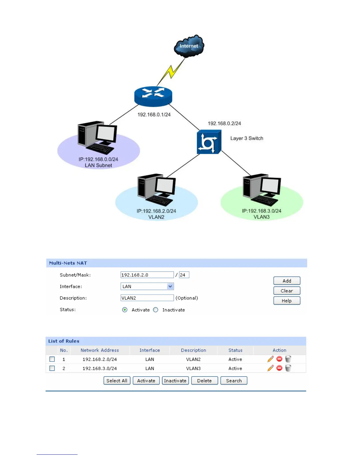 1. Establish the Multi-Nets NAT entries with Subnet/Mask of VLAN2 and VLAN3.