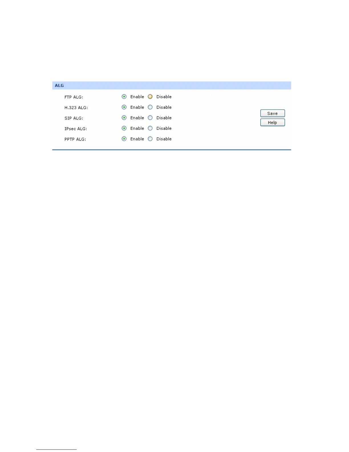Some special protocols such as FTP, H.323, SIP, IPsec and PPTP will work properly only when ALG