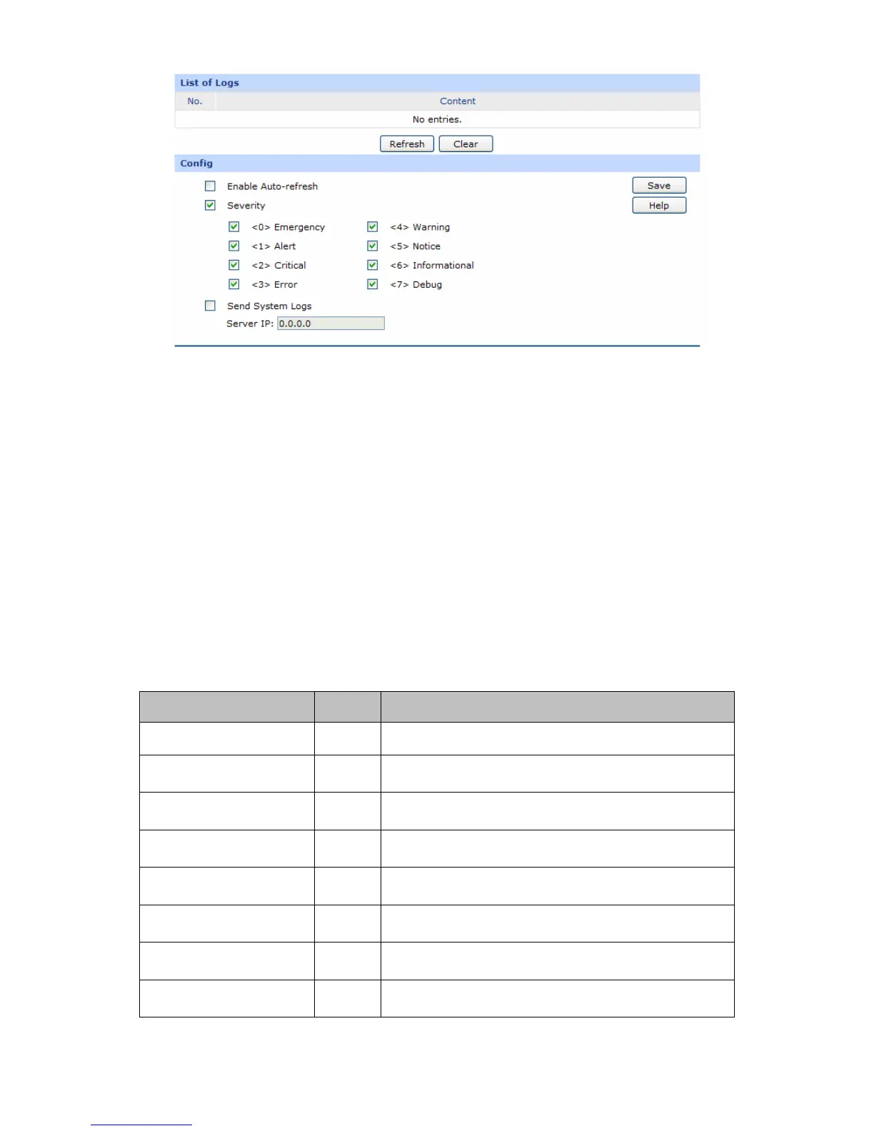 List of Logs displays the system log information in log buffer. An entry of log contains the following four