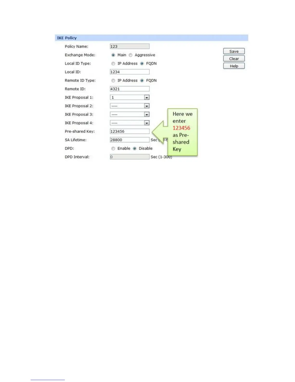 Under IKE Proposal 1, we select 1 in this example. Enter Pre-shared Key and SA Lifetime you