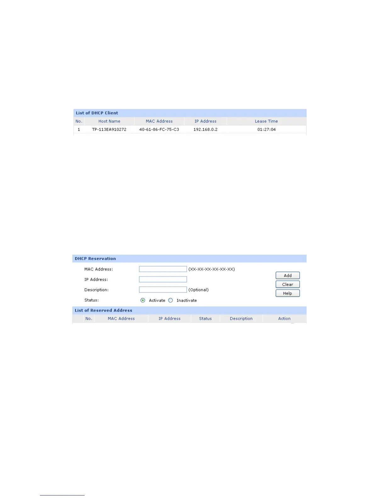 You can view the information of the DHCP clients in this table. Click the Refresh button for the updated