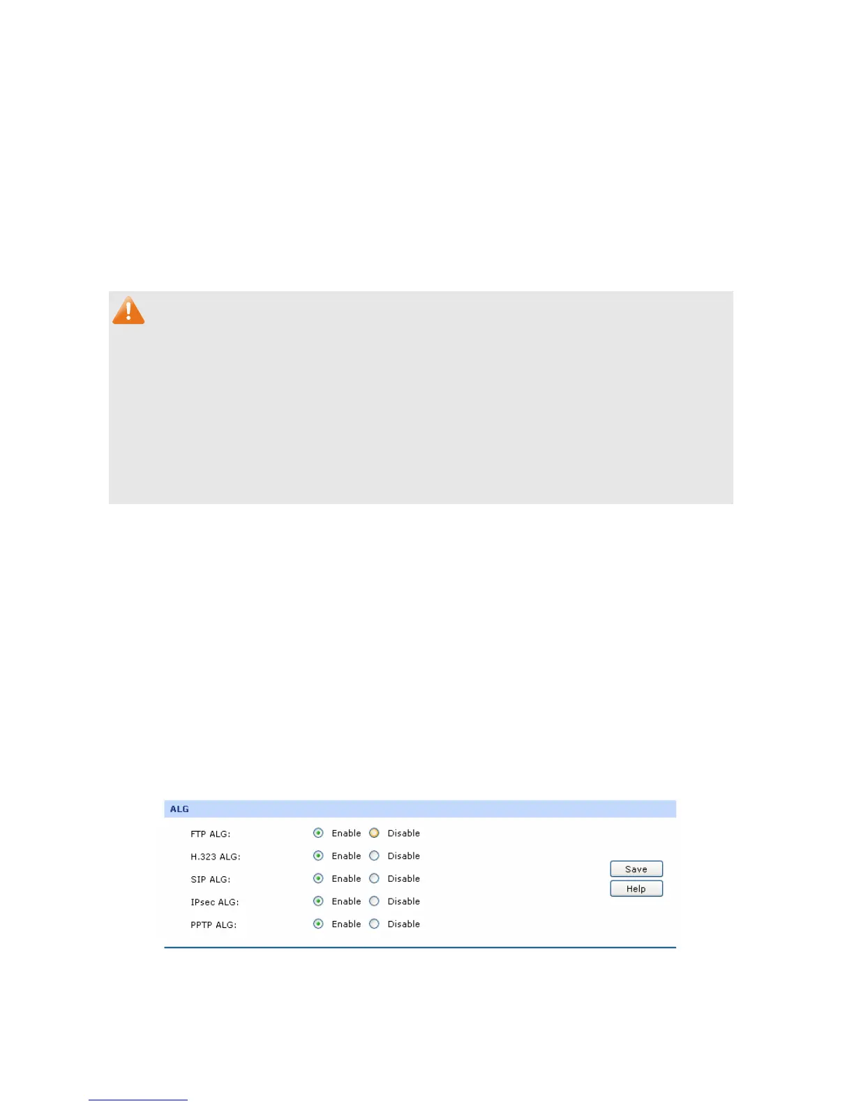 Some special protocols such as FTP, H.323, SIP, IPsec and PPTP will work properly only when ALG