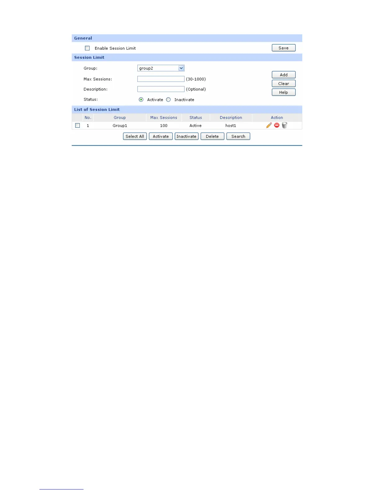 Choose the menu Advanced→Session Limit→Session List to load the following page.