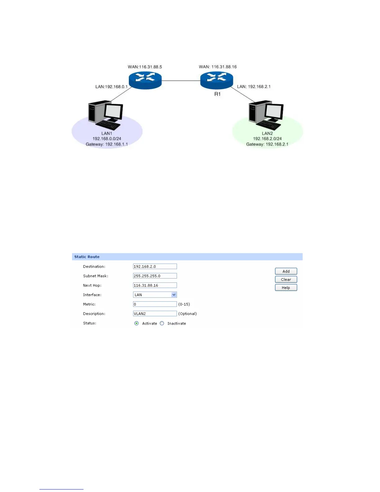 You can set a Static Route entry: Enter the WAN IP address of R1 (116.31.88.16) in the Next Hop field