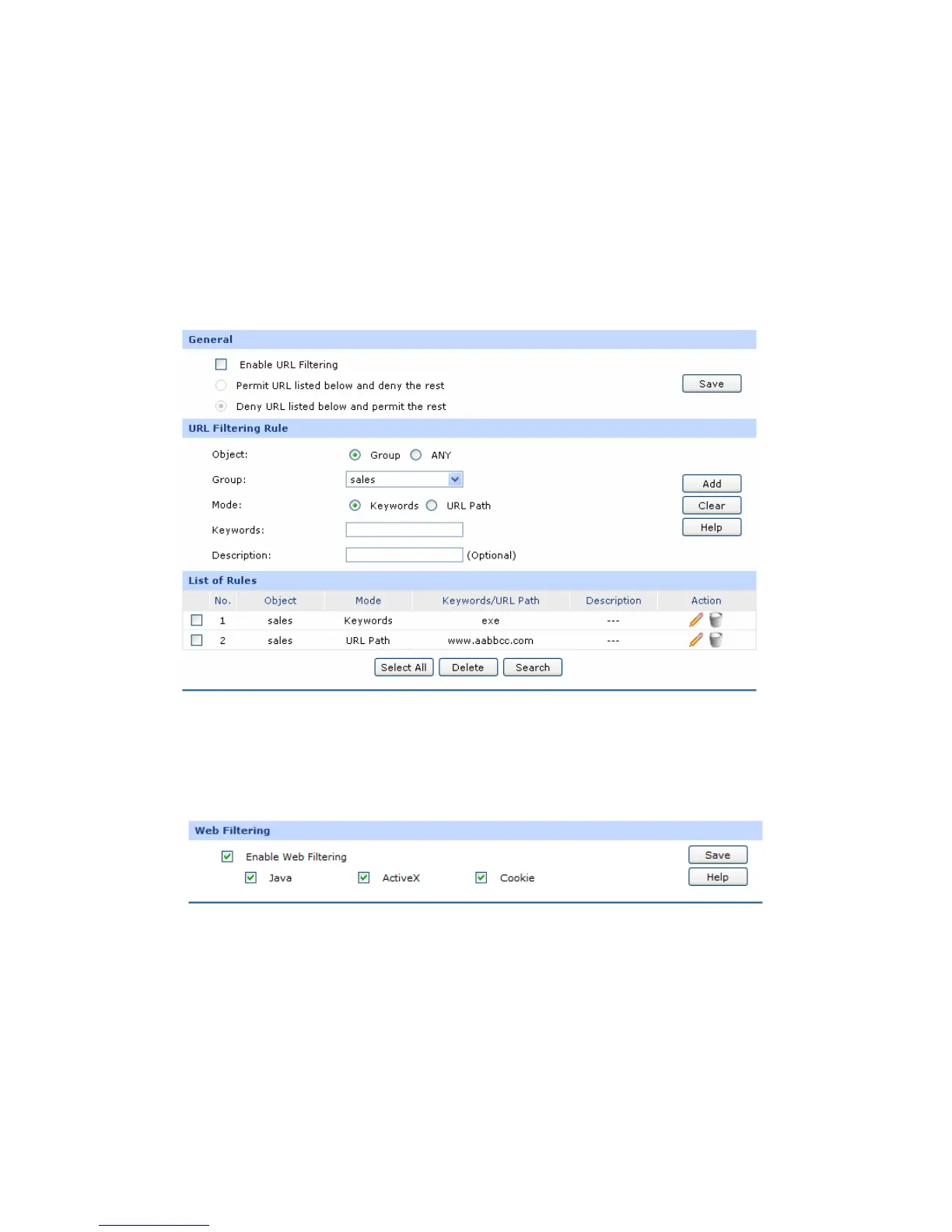 Choose the menu Firewall→Access Control→Web Filtering to load the following page.