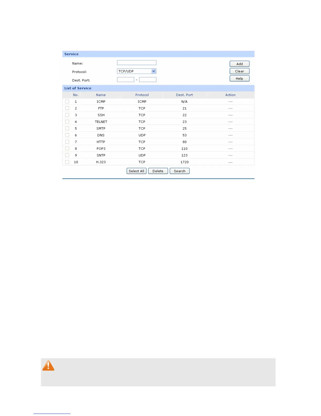 Choose the menu Firewall→Access Control→Service to load the following page.