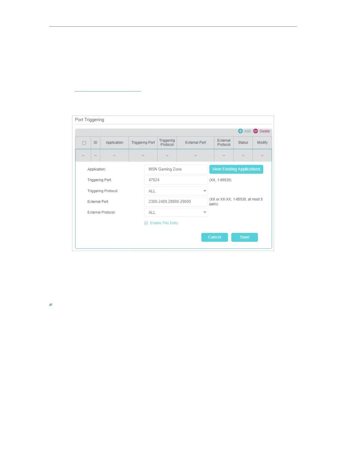 2. Go to Advanced > NAT Forwarding > Port Triggering and click Add.
