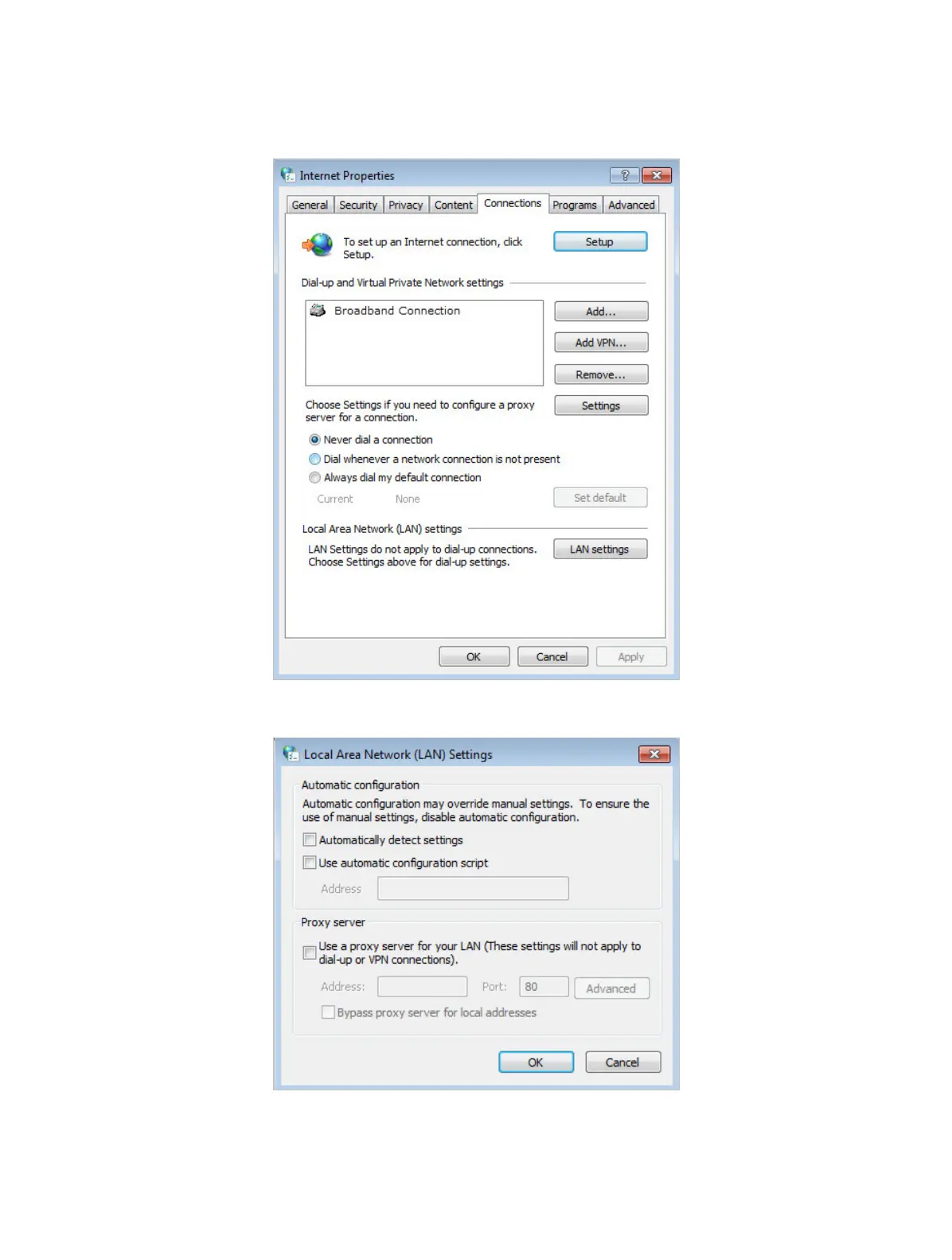 4 ) Click LAN settings, deselect the following three options and click OK;