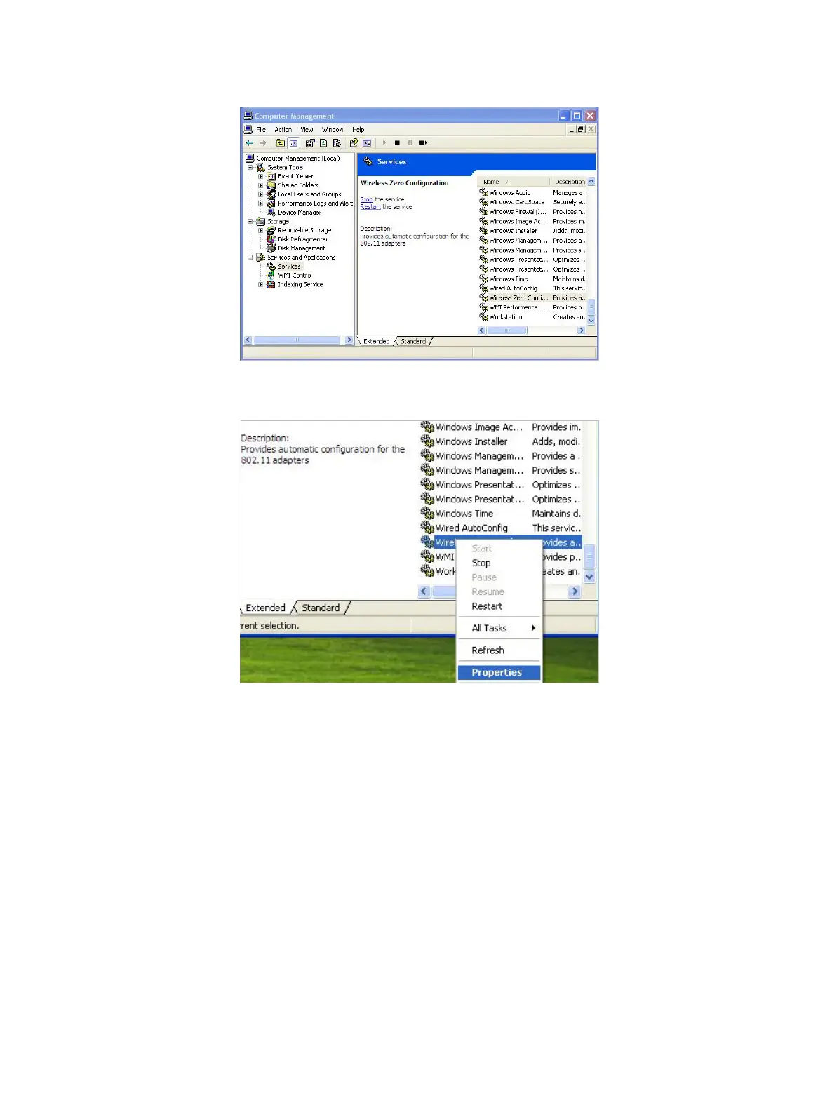 5 ) Select Wireless Zero Configuration, right click it, and then select Properties;