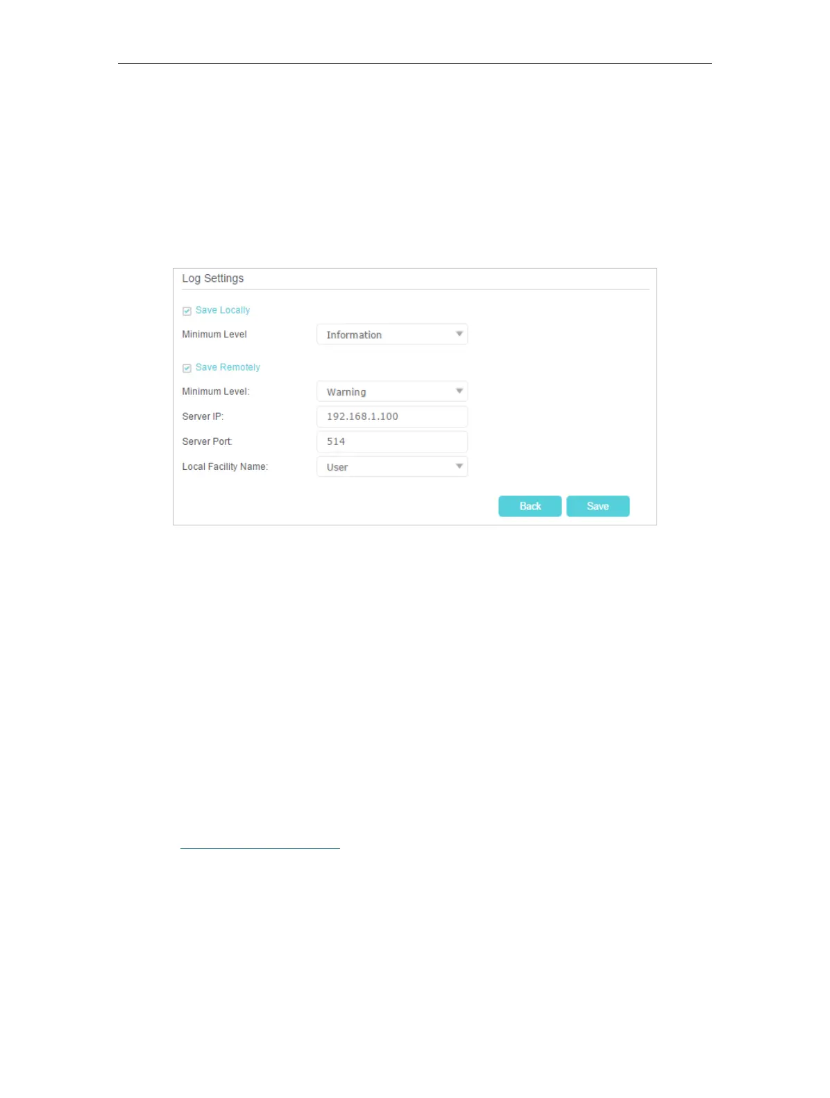 • Save Locally - Select this option to cache the system log to the router’s local memory,