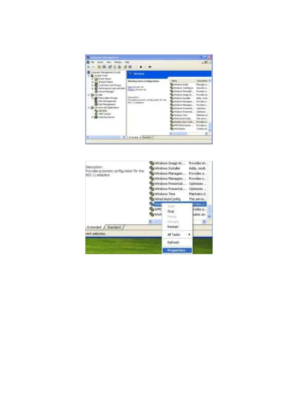 5 ) Select Wireless Zero Configuration, right click it, and then select Properties;
