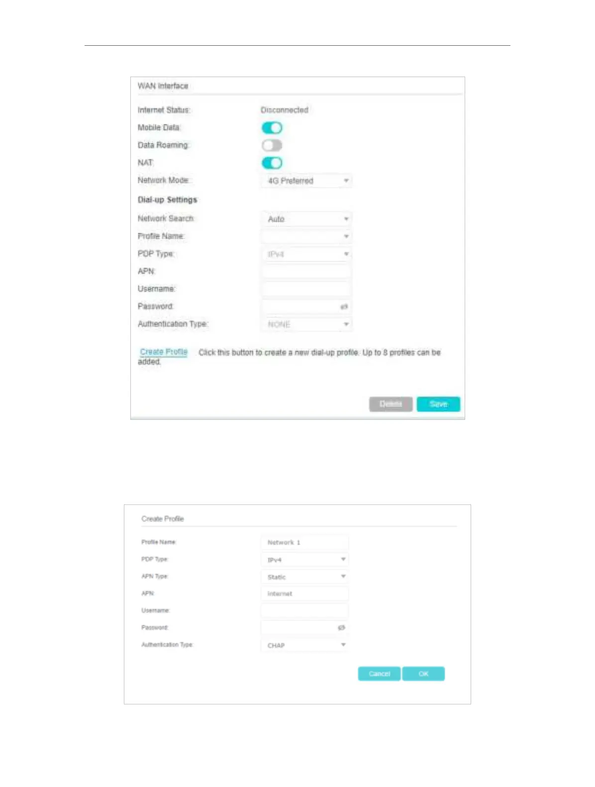 Profile Name, Username and Password. Select the PDP Type, APN Type