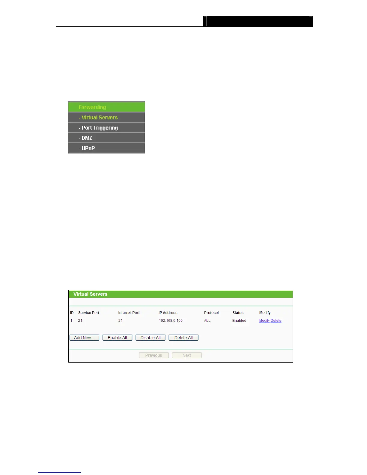 Choose menu “Forwarding→Virtual Servers”, and then you can view and add virtual servers