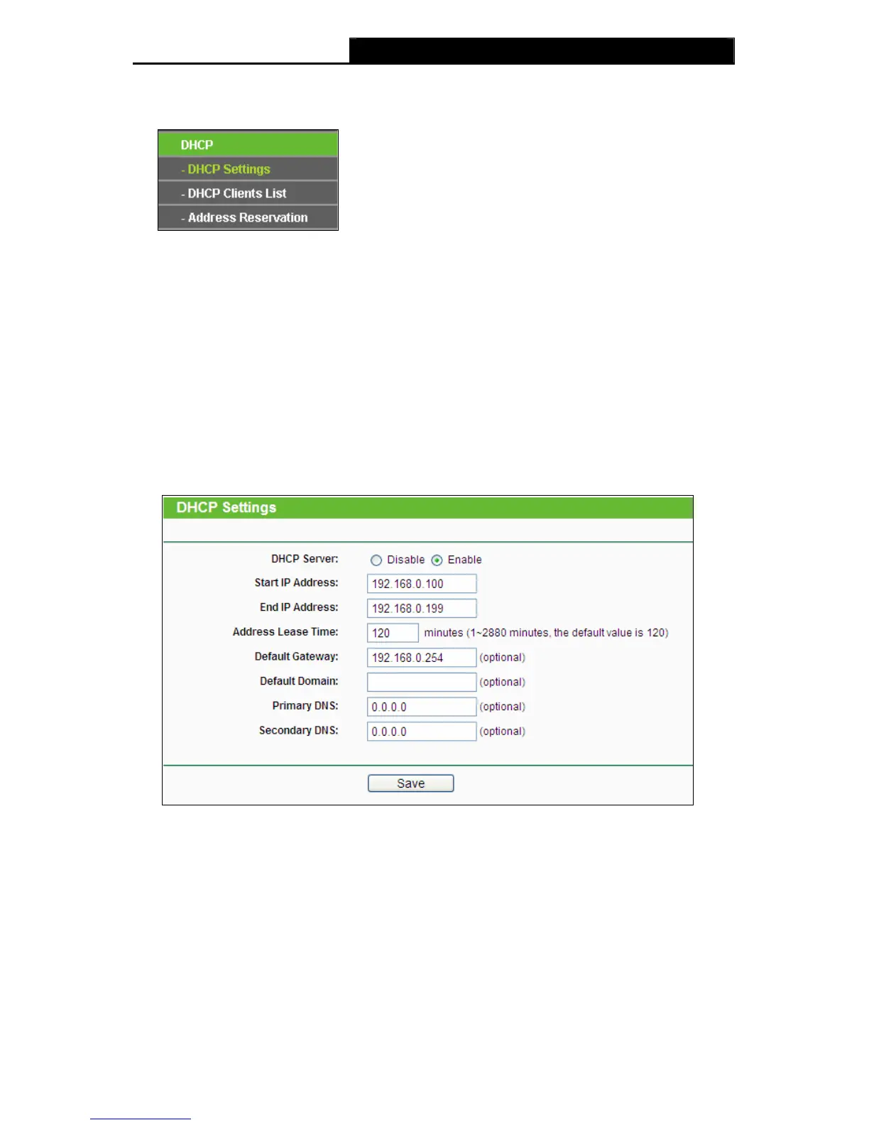 There are three submenus under the DHCP menu (shown in Figure 5-26): DHCP Settings,