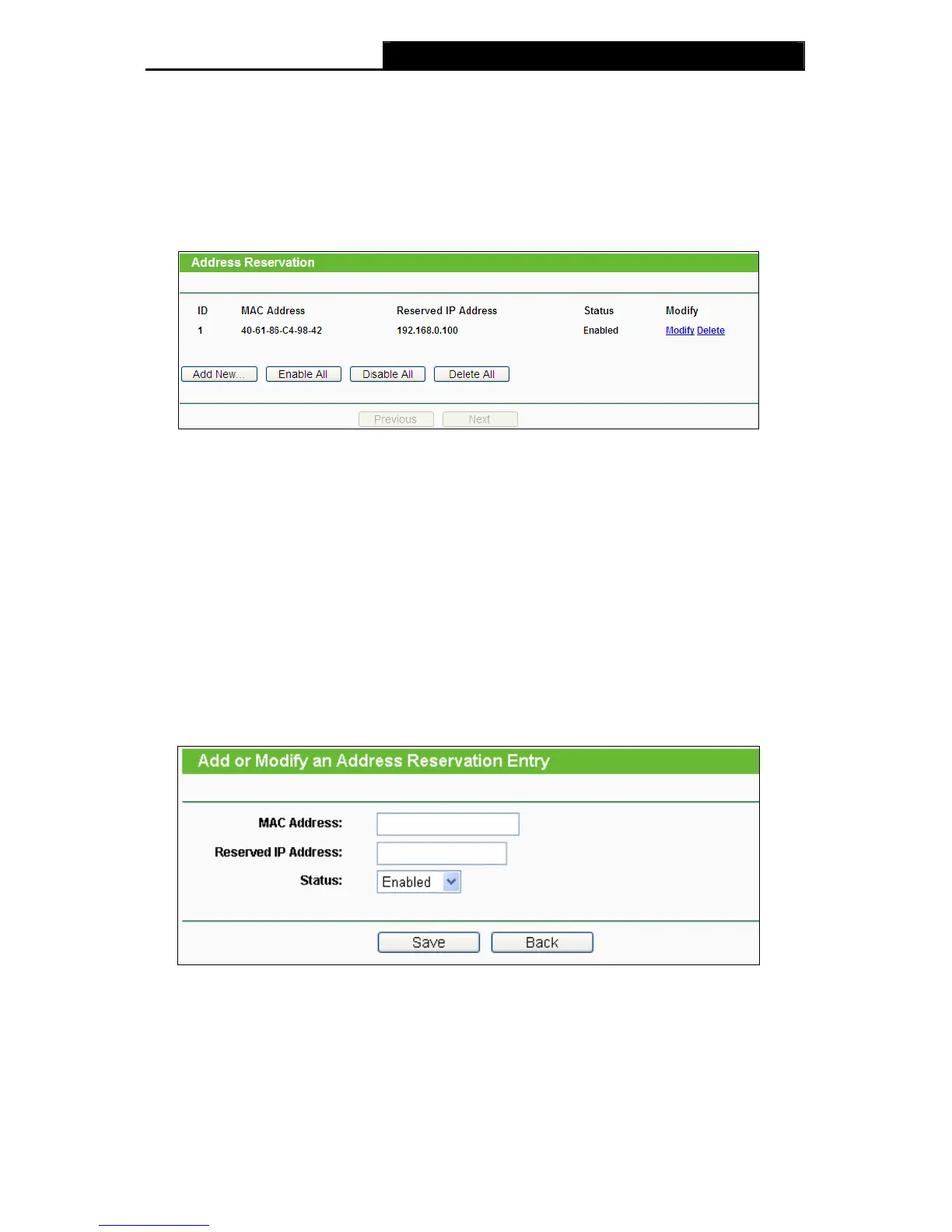 Choose menu “DHCP→Address Reservation”, and then you can view and add a reserved