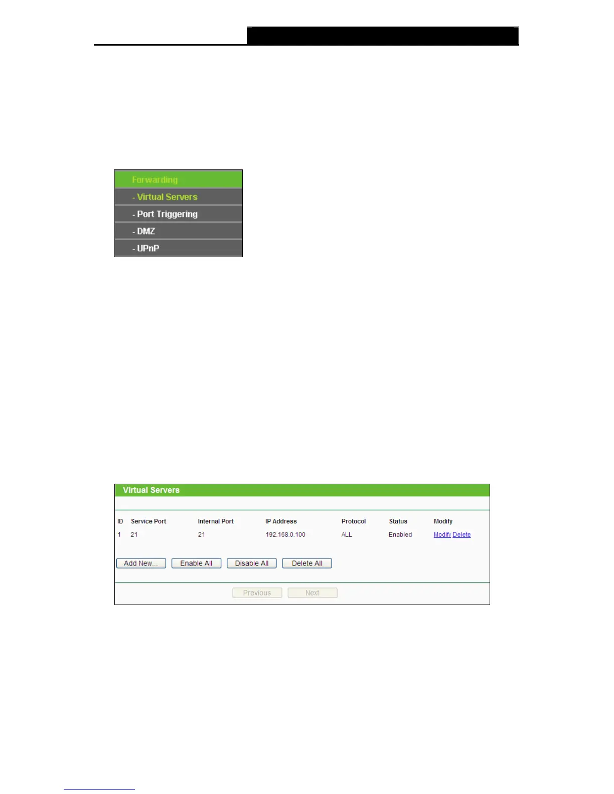 Choose menu “Forwarding→Virtual Servers”, and then you can view and add virtual servers