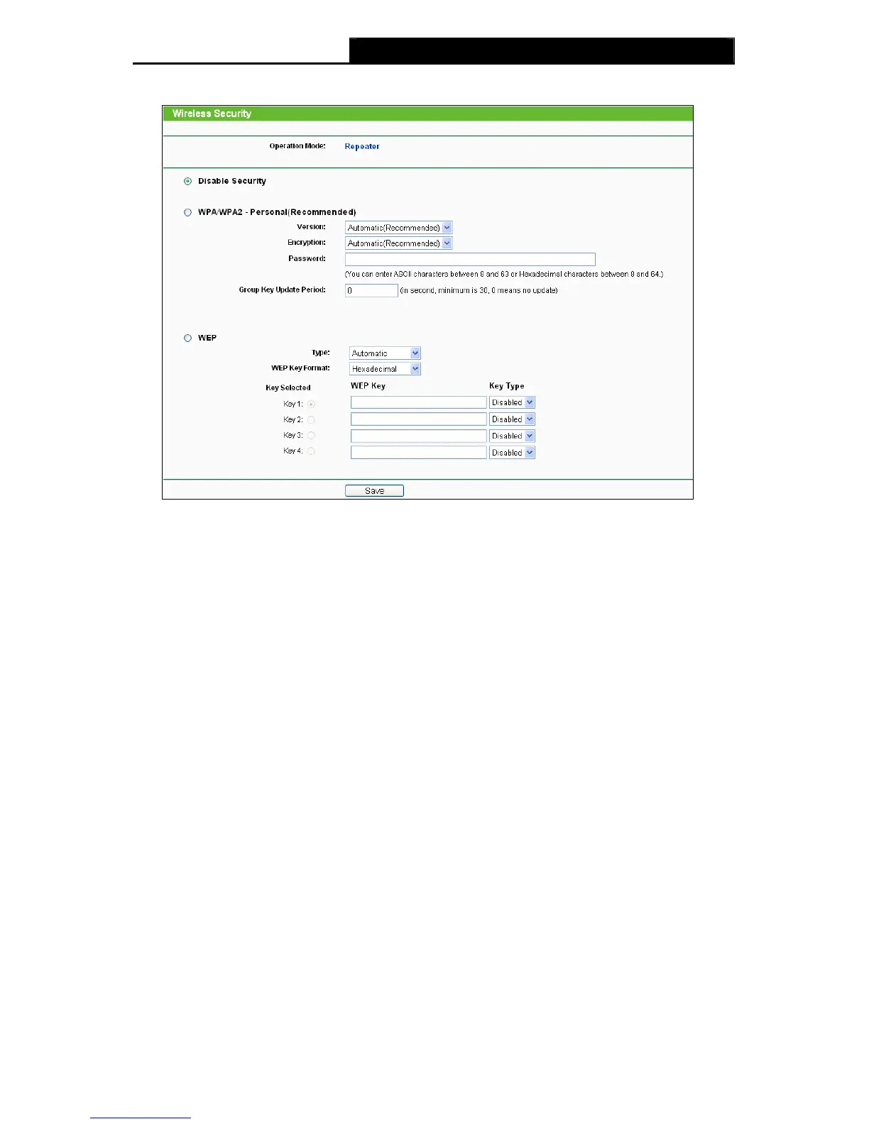 ¾ Disable Security - Check this box radio button to disable wireless security. If disabled, the