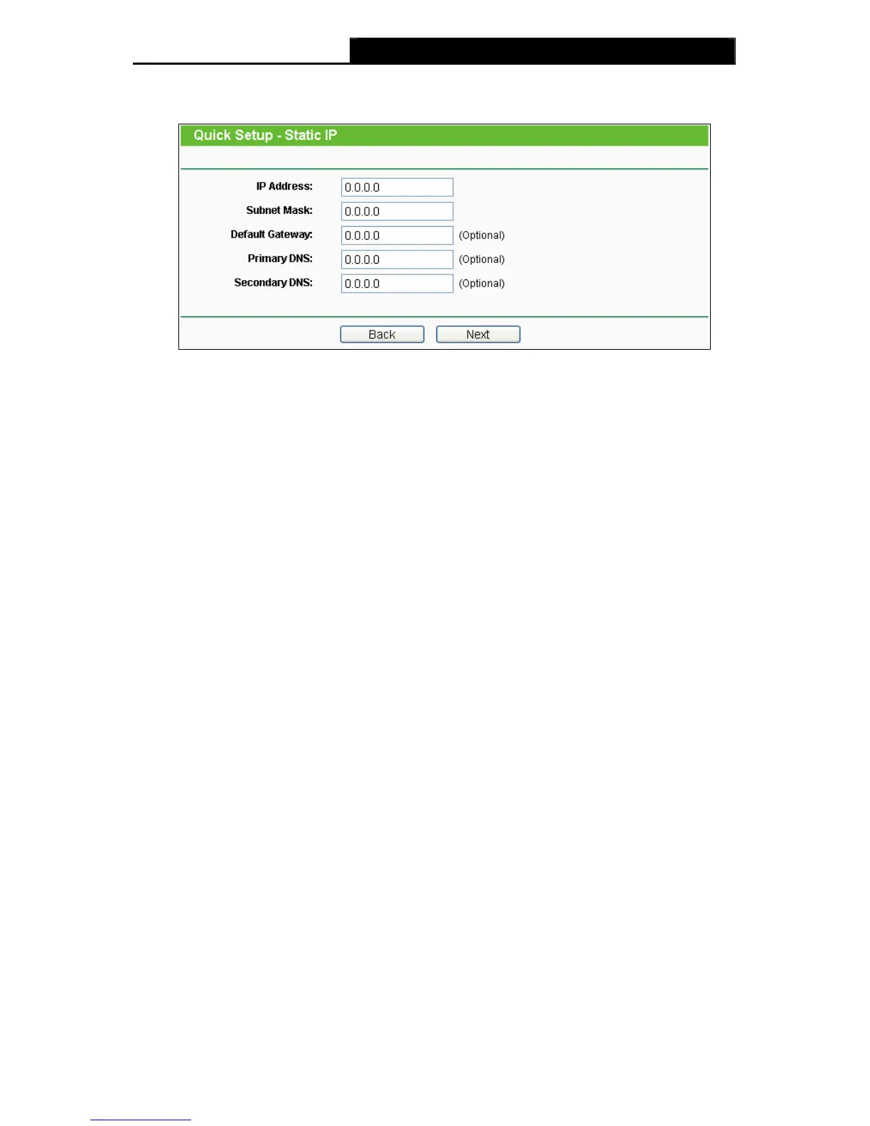 ¾ If the connection type detected is Static IP, the next screen will appear as shown in