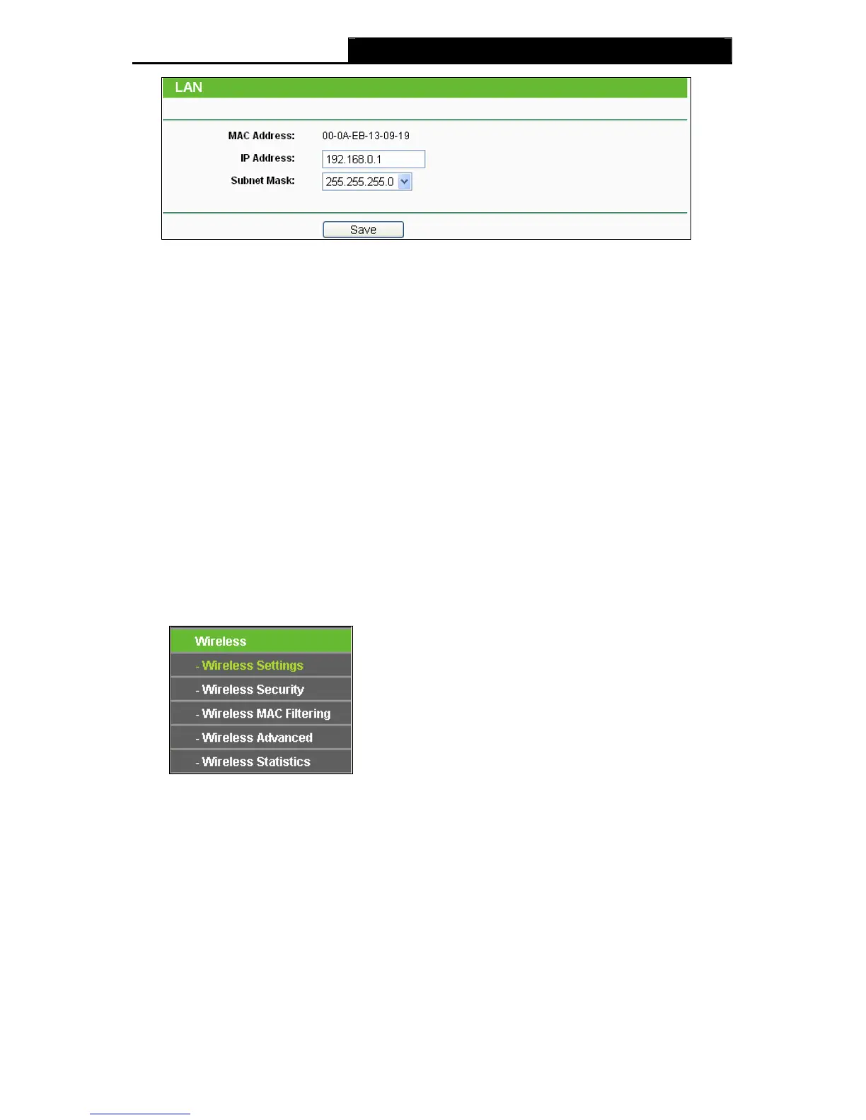 Wireless Security, Wireless MAC Filtering, Wireless Advanced and Wireless Statistics.