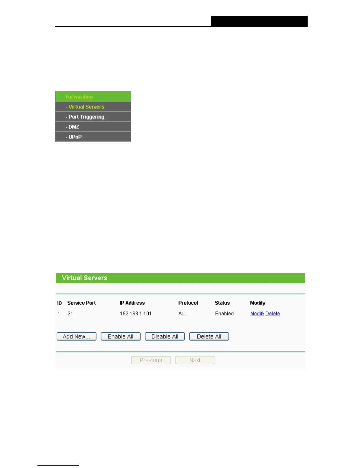 Choose menu “Forwarding→Virtual Servers”, you can view and add virtual servers in the