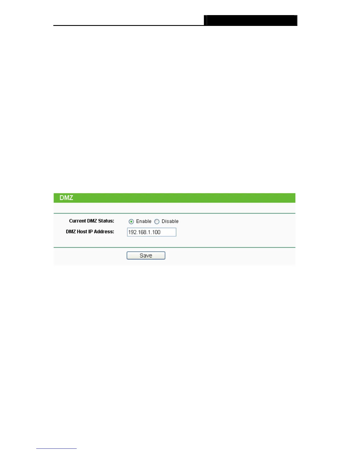 Choose menu “Forwarding→DMZ”, you can view and configure DMZ host in the screen