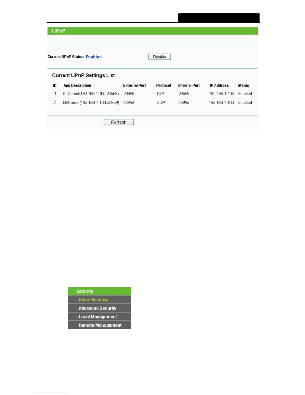 ¾ Current UPnP Settings List - This table displays the current UPnP information.