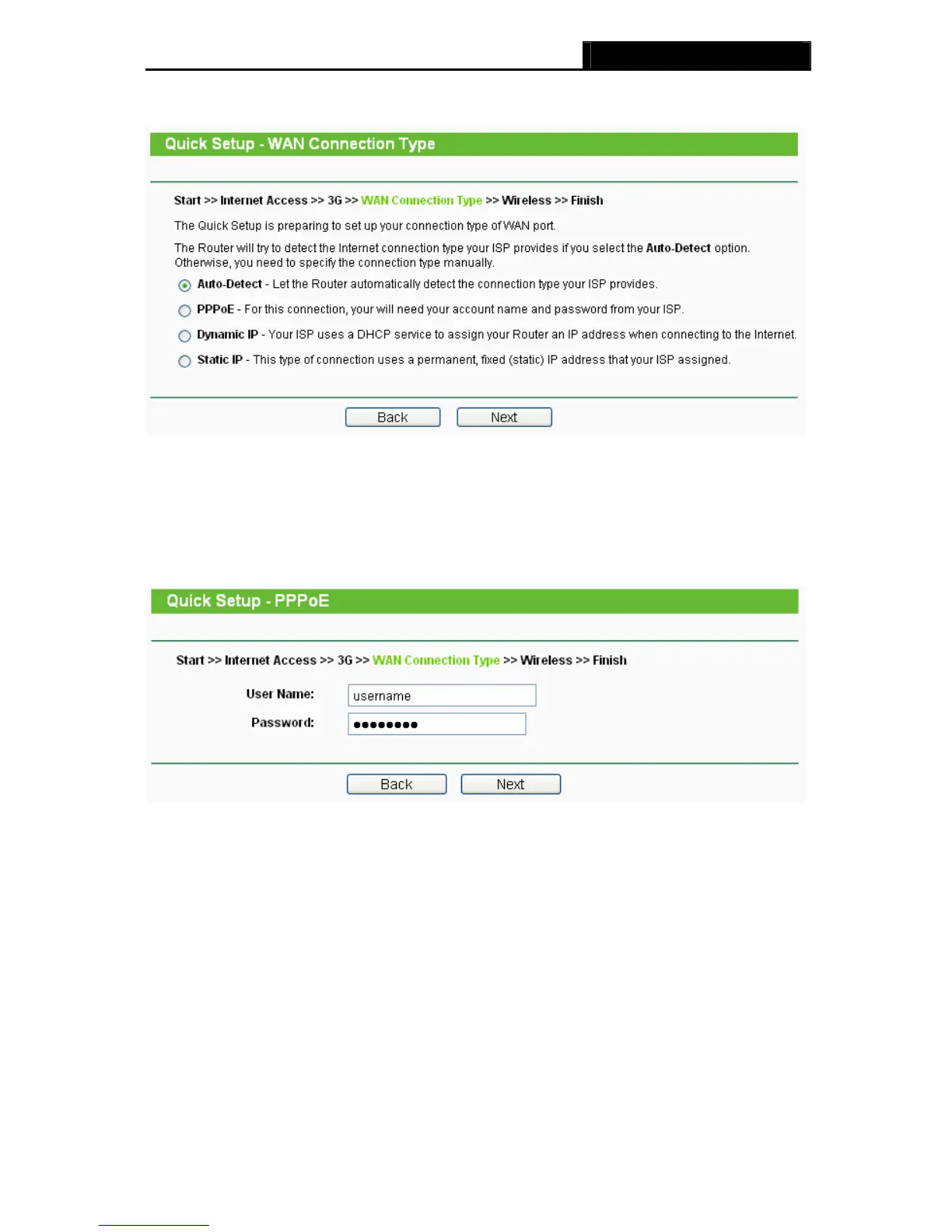 ¾ If the connection type detected is PPPoE, the next screen will appear as shown in Figure 3-9.