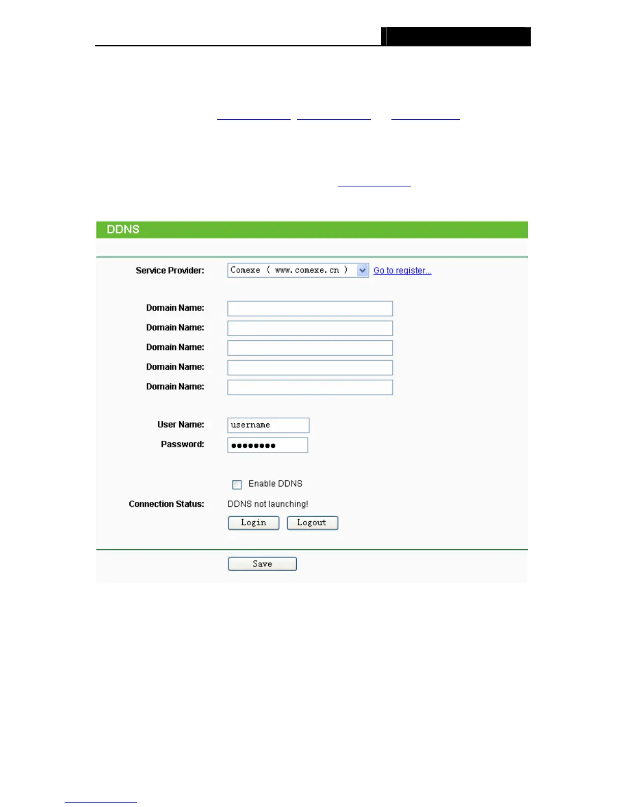 If the dynamic DNS Service Provider you select is www.comexe.cn, the page will appear as