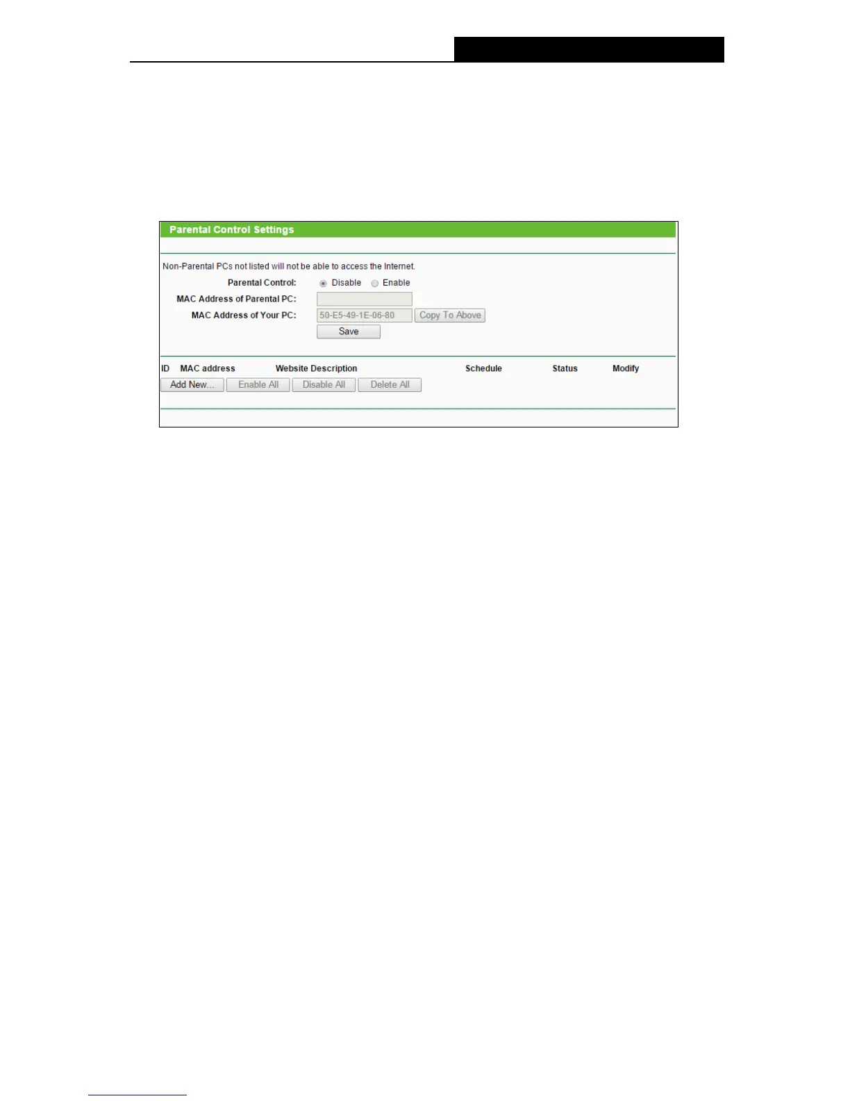 Copy To Above button to fill this address to the MAC Address of Parental PC field above.