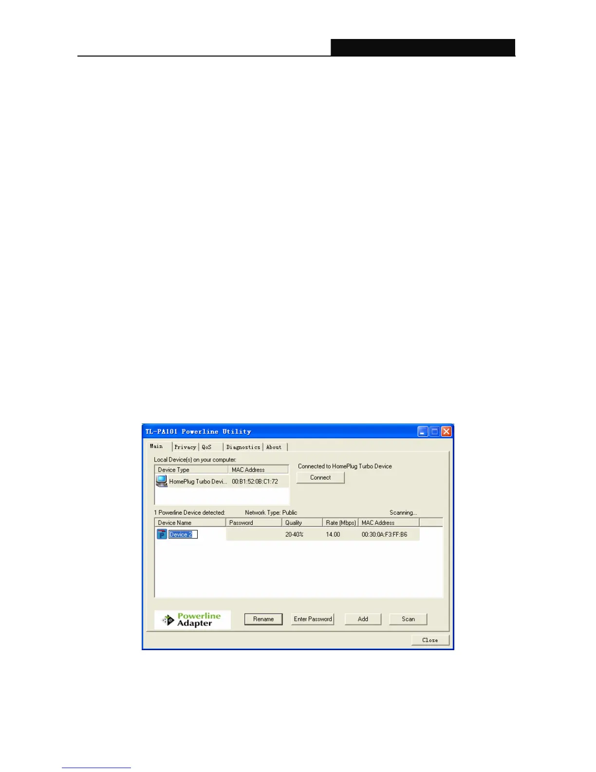 ¾ Scan: Click the “Scan” button to perform an immediate search of the Powerline Ethernet Adapter