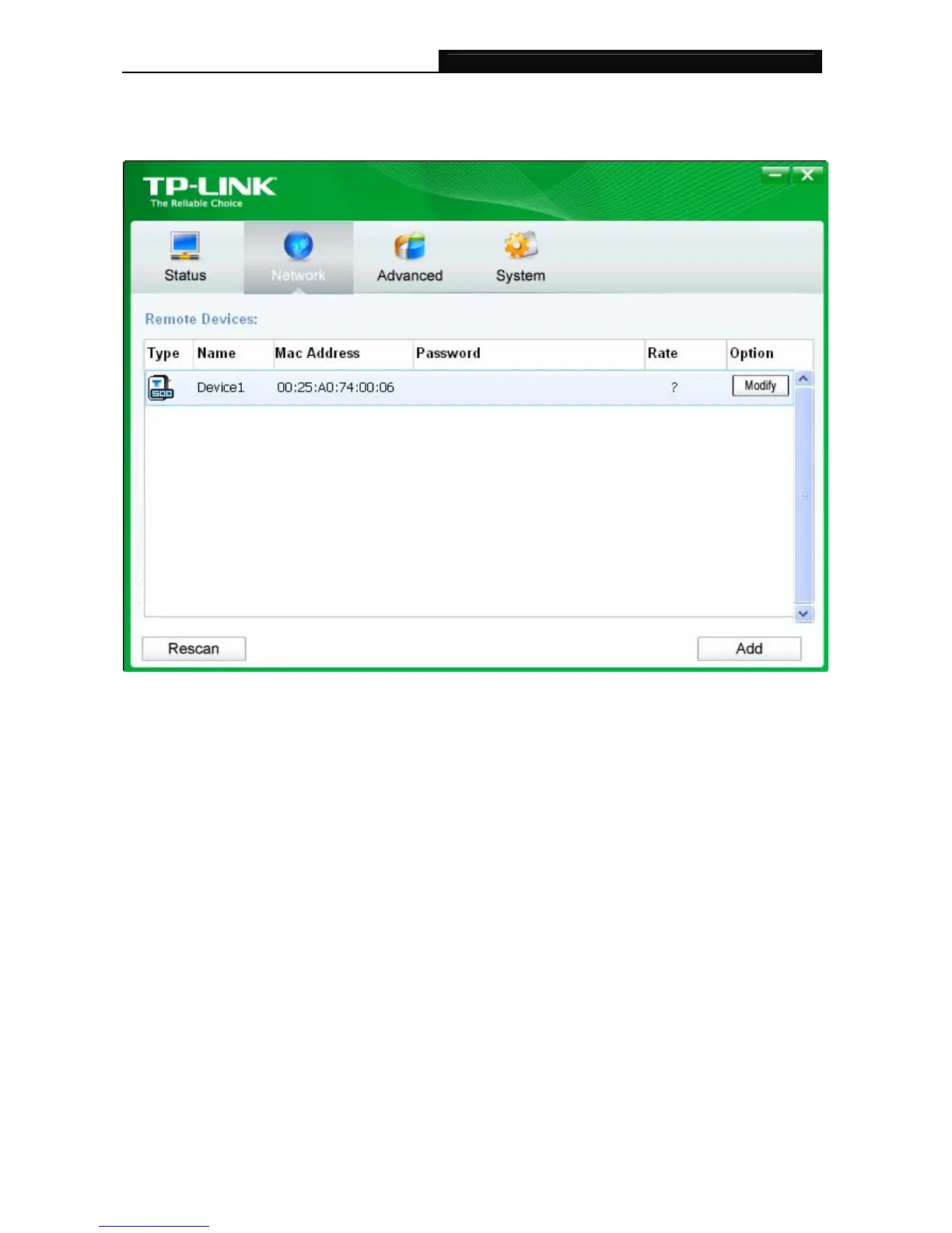 ¾ Rescan: Click the “Rescan” button to perform an immediate search of the remote Powerline