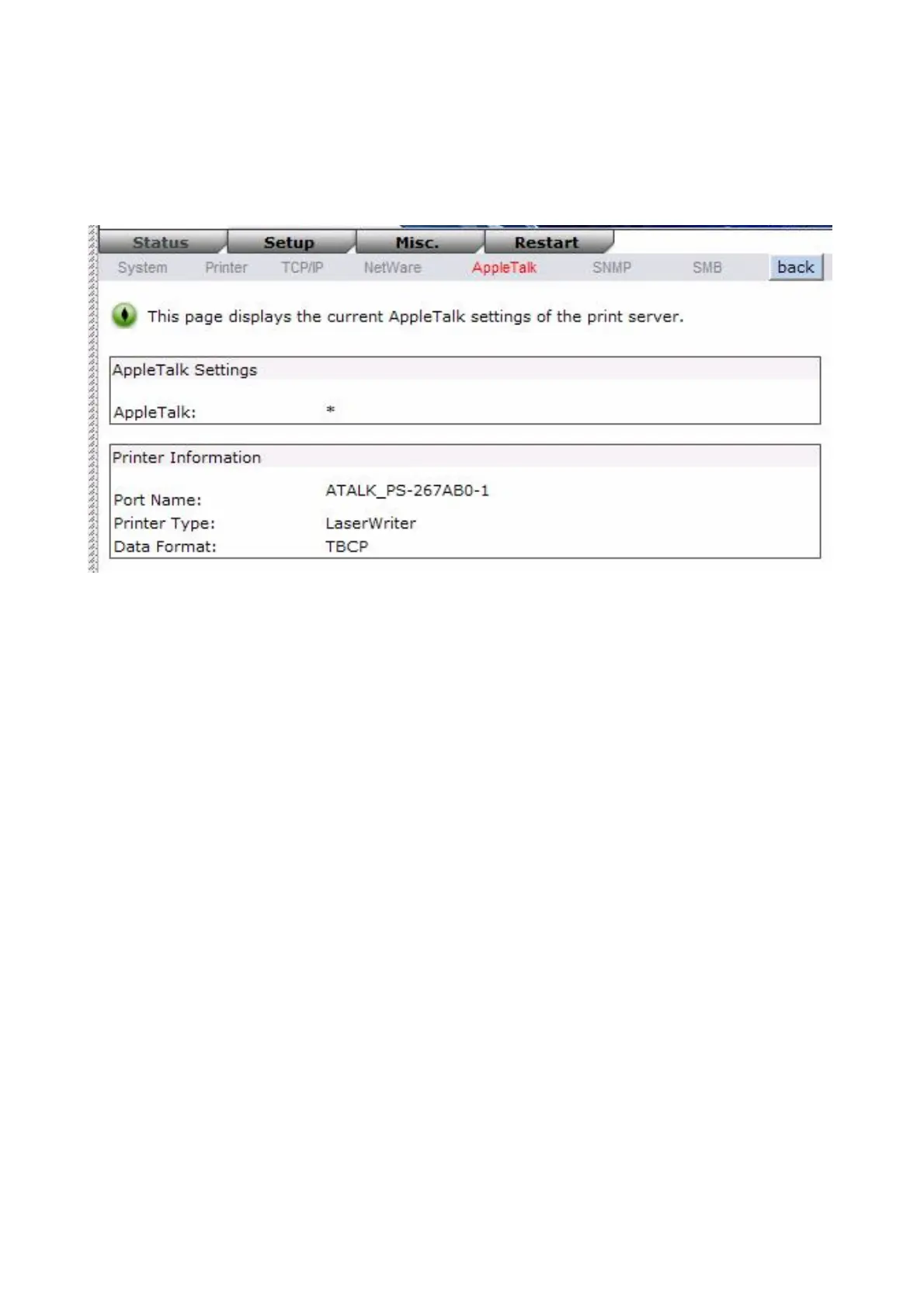 an asterisk (*) in the current AppleTalk Status of the print server in the web