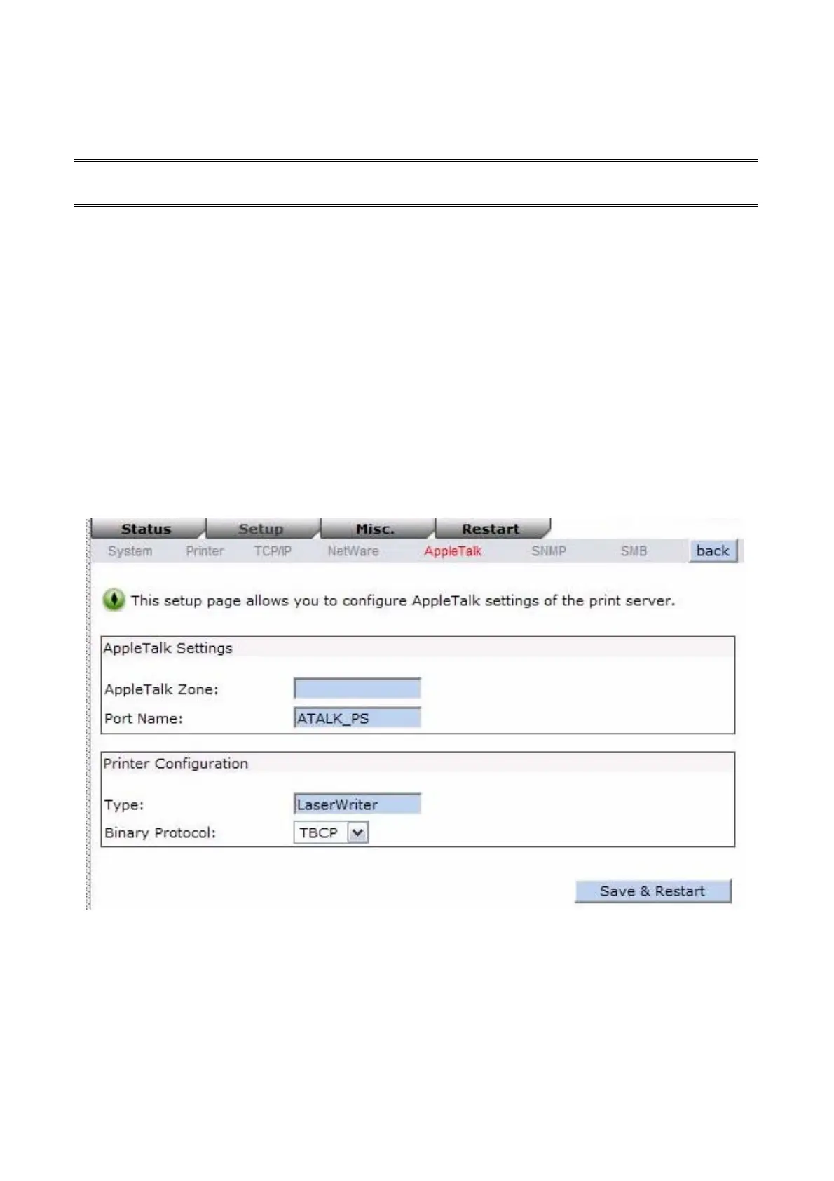 Ethernet using AppleTalk protocol. The basic configuration is for the print server in an