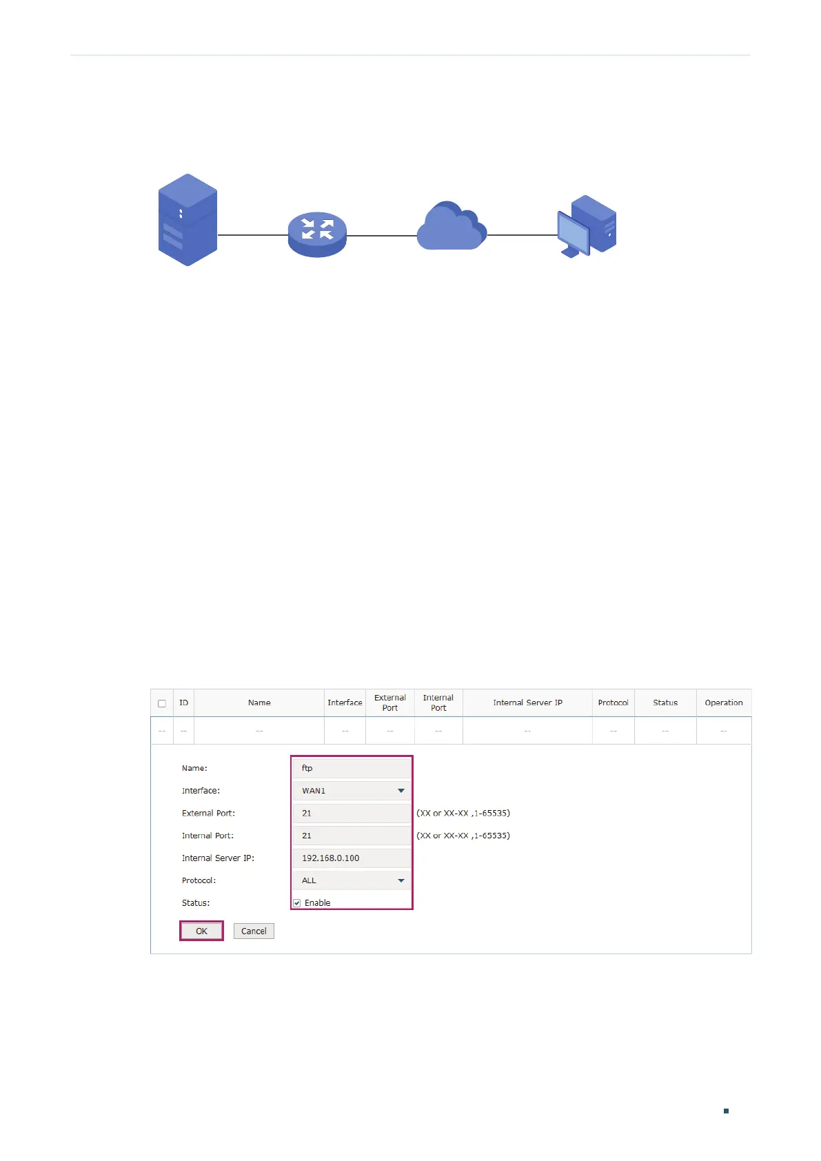 external port as 21, enter the IP address of FTP server (192.168.0.100) as the internal